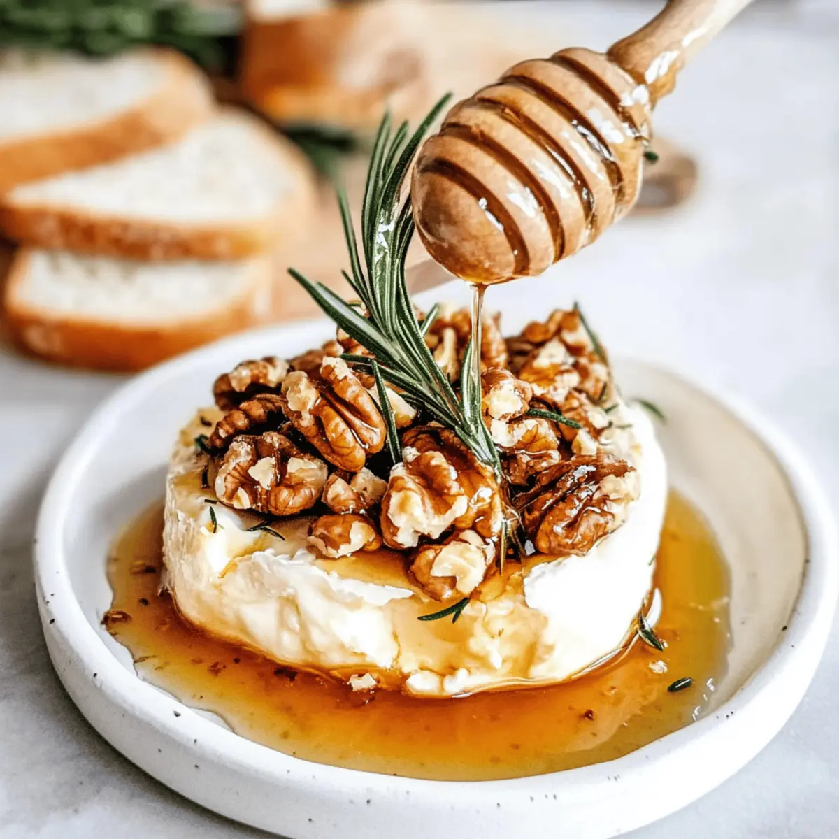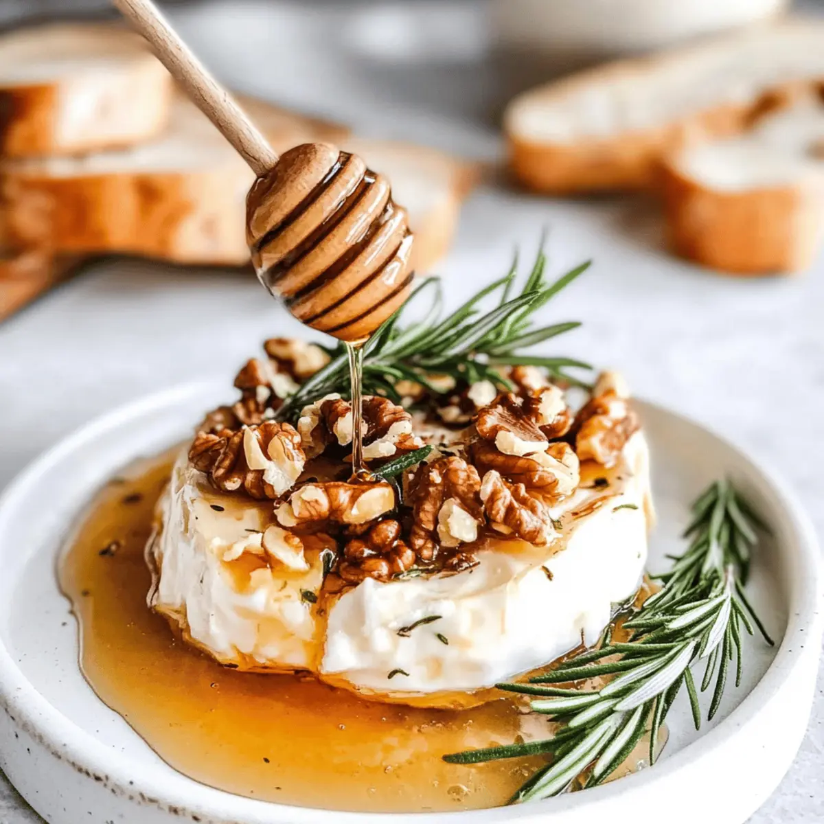 Drizzle a generous amount of honey over both the walnuts and the brie. This sweet touch will caramelize slightly in the oven, creating a beautiful contrast with the creamy cheese. Then, gently place fresh rosemary sprigs on top for an aromatic finish that elevates the dish’s overall flavor profile.
