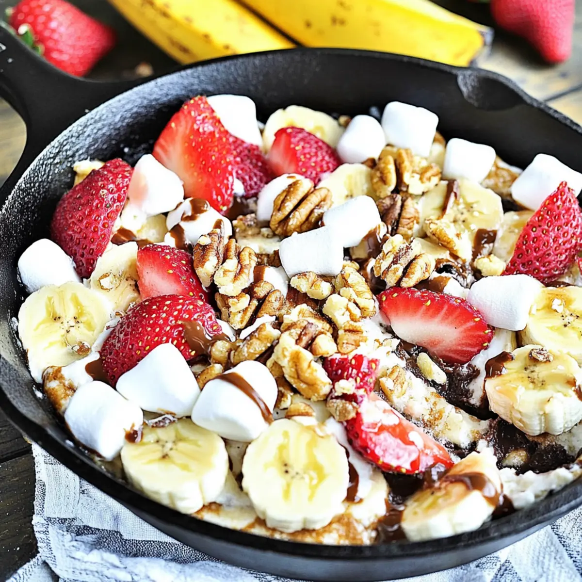 Preparing your Banana Split S’mores Dip in advance is an excellent way to save time, especially on busy days! You can assemble the dip up to 24 hours ahead. Simply follow the first four steps: crush the graham crackers, add the chocolate layer, layer the marshmallows, and place the fresh fruit on top. Cover the skillet tightly with plastic wrap and refrigerate it until you’re ready to enjoy. When it’s time to serve, uncover the skillet and broil or grill it as directed—just keep an eye on it while cooking to ensure the marshmallows toast beautifully. This make-ahead option allows you to create a scrumptious dessert with minimalist effort, ensuring all the gooey, deliciousness is maintained!