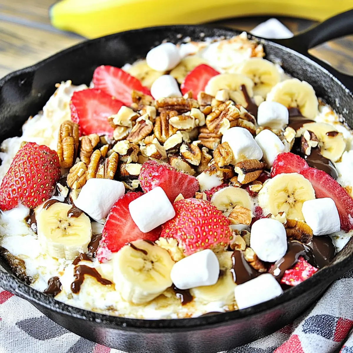 Slice up a banana and prepare some strawberries, then artfully place them on top of the marshmallows for a fresh burst of flavor. Sprinkle ¼ cup of chopped pecans and an additional tablespoon of chocolate chips over the fruit. This combination adds a delightful crunch and extra sweetness to your Banana Split S’mores Dip.