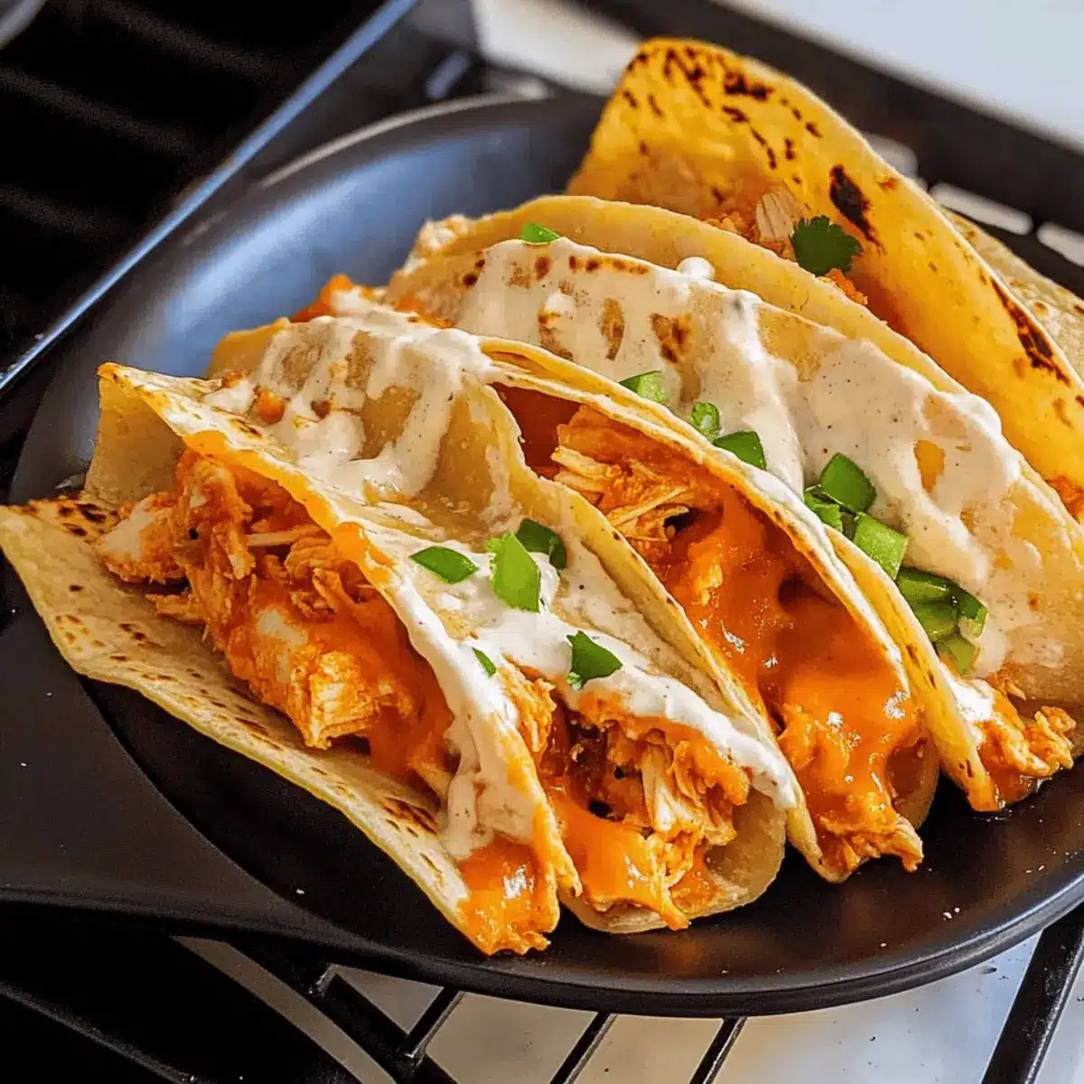 Once cooked, remove the tacos from the skillet and let them cool for a moment. Transfer them to a serving platter and garnish generously with chopped green onions for a fresh pop of color and flavor. Serve these mouthwatering buffalo chicken tacos immediately, perhaps with extra ranch dressing on the side for dipping, and enjoy a delicious, homemade meal!