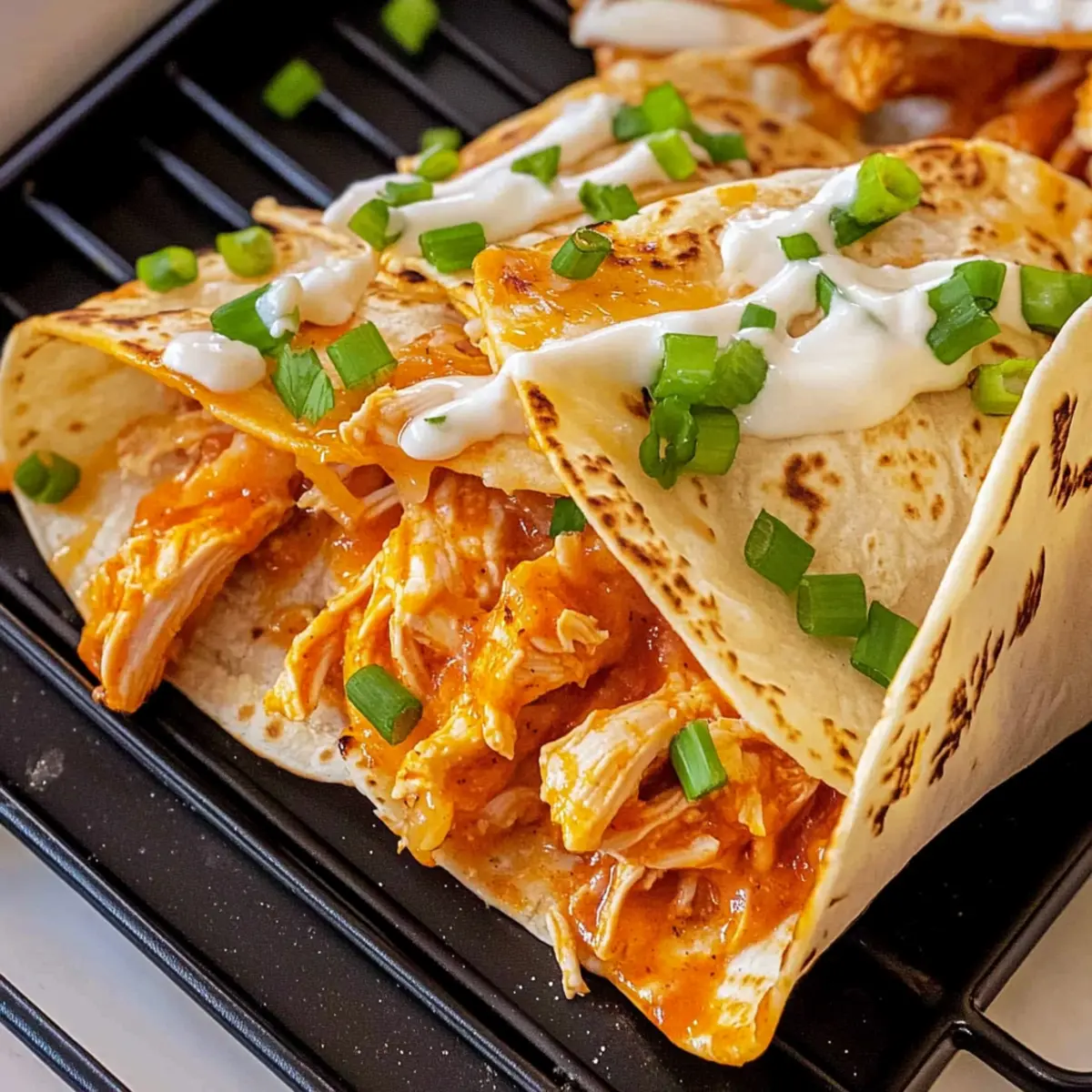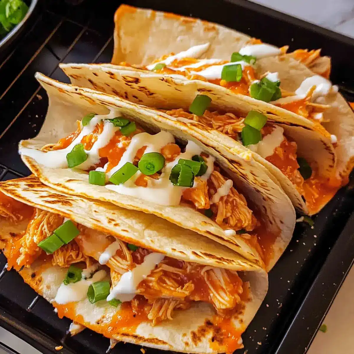 Remove the tacos from the skillet and place them on a serving plate. Garnish with freshly chopped green onions and any additional toppings you desire, like sliced jalapeños or extra ranch dressing for even more flavor. Your Buffalo chicken tacos are now ready to be enjoyed fresh and hot!