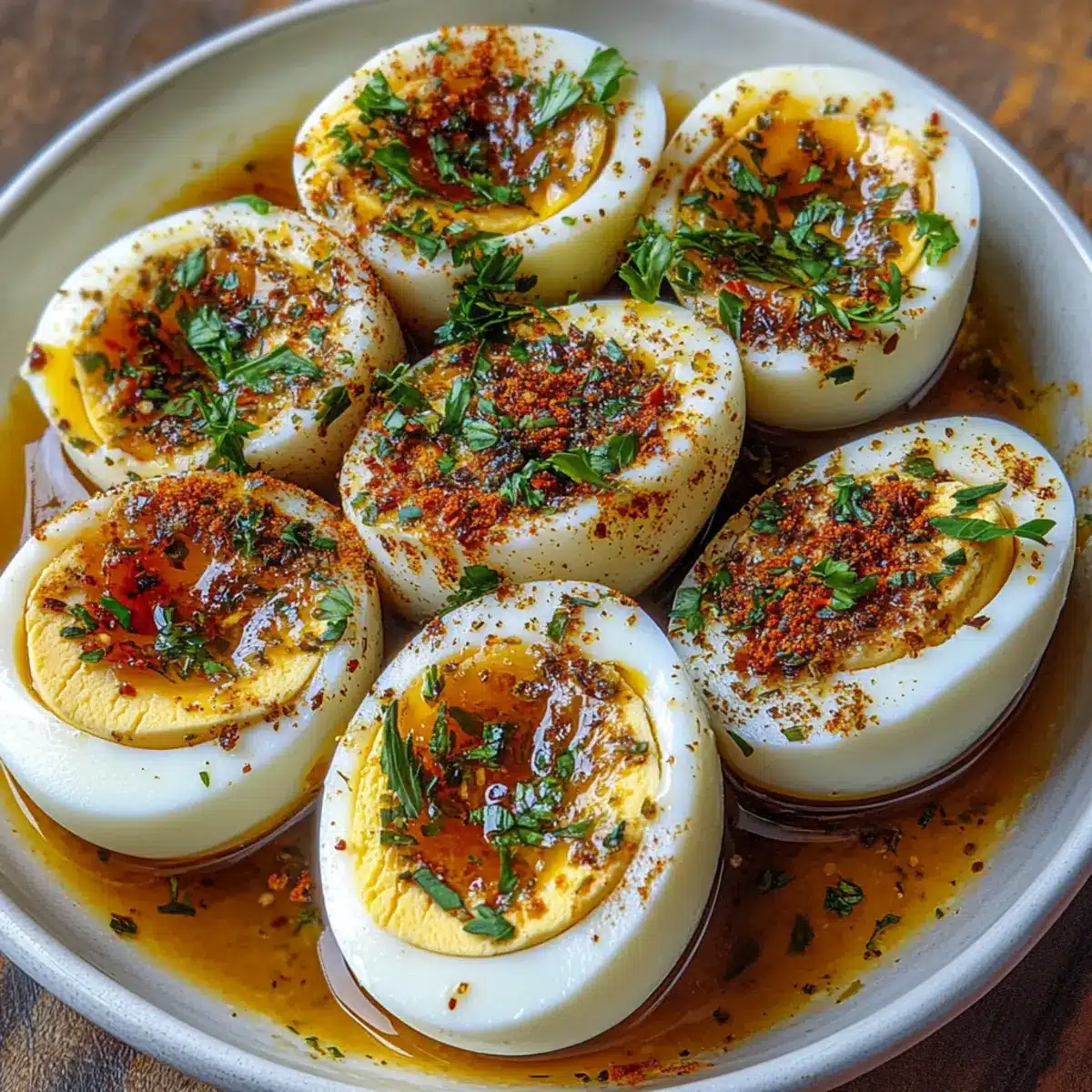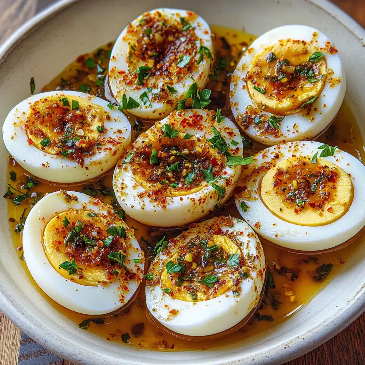 Once the sauce has developed a robust flavor, take the peeled hard-boiled eggs and place them in a large bowl. Carefully pour the hot spicy garlic butter sauce over the eggs, making sure they are well-coated. If you prefer a little extra spice, feel free to add a pinch of red pepper flakes directly onto the eggs for that additional kick!