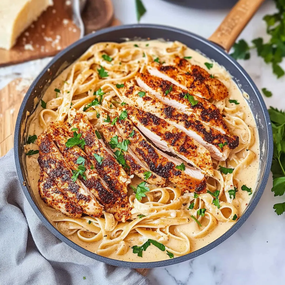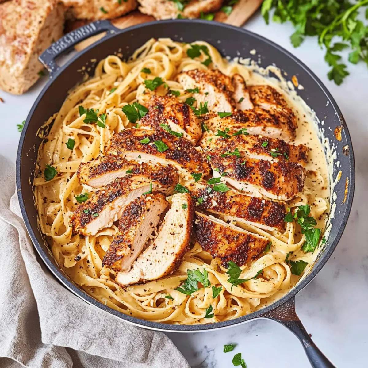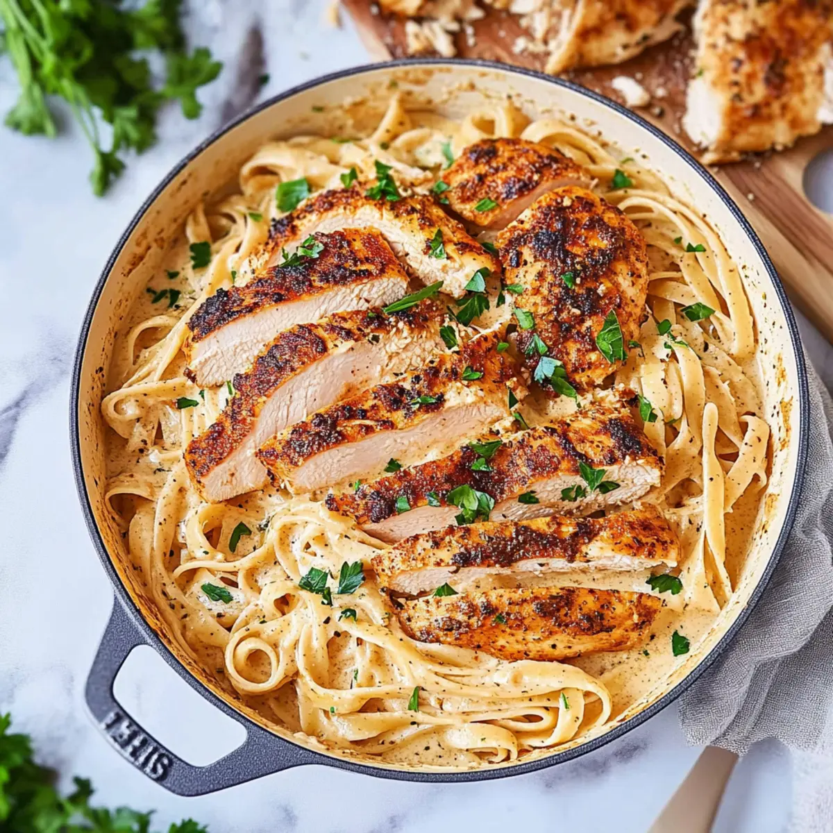 - Add cooked fettuccine, reserved pasta water, and minced parsley to the sauce. Toss until pasta is evenly coated. Slice rested chicken and arrange on top of pasta. Garnish with extra parsley and serve.