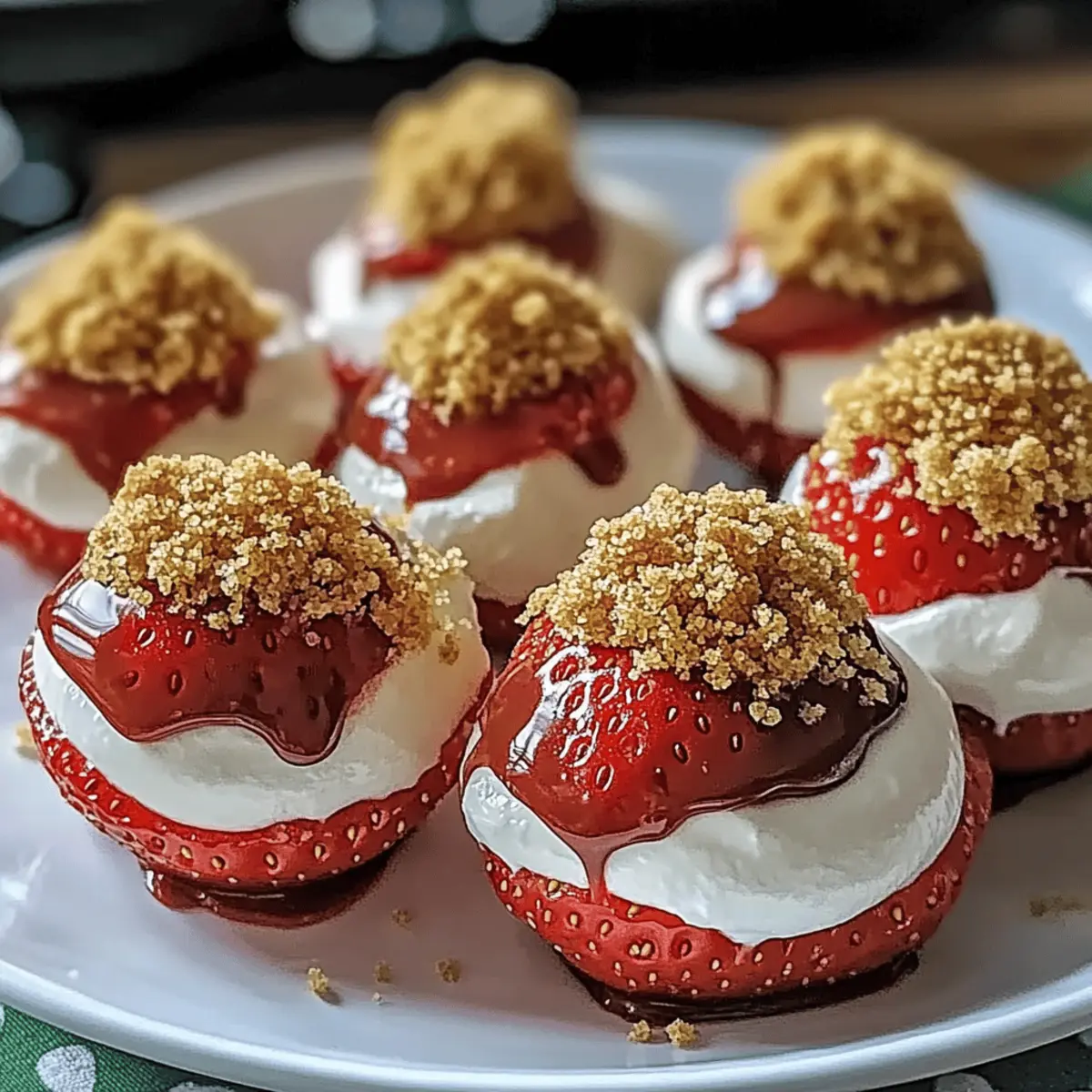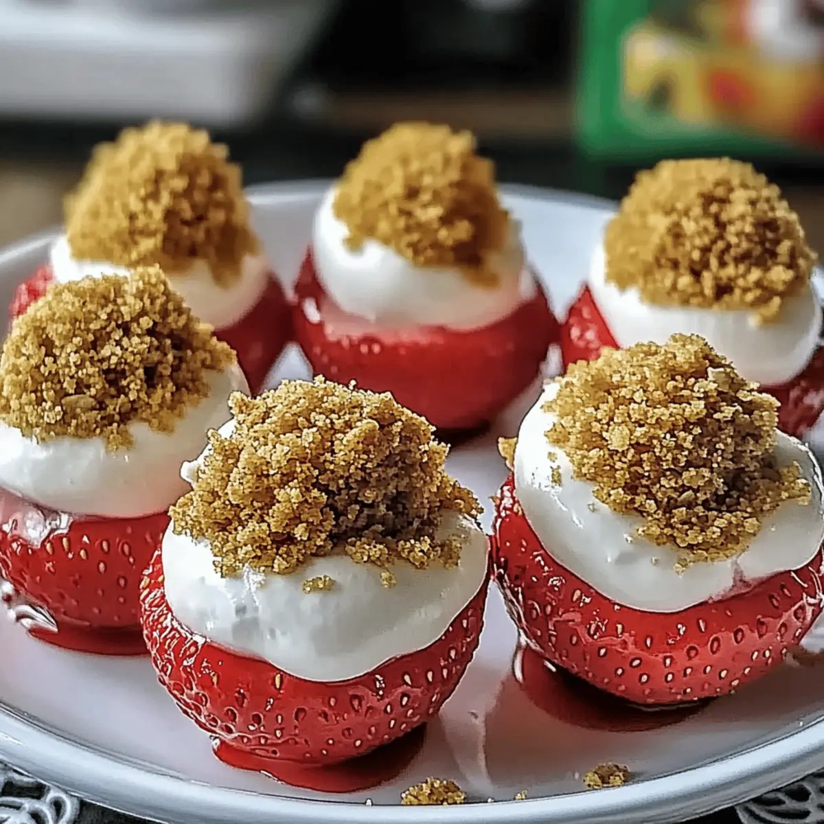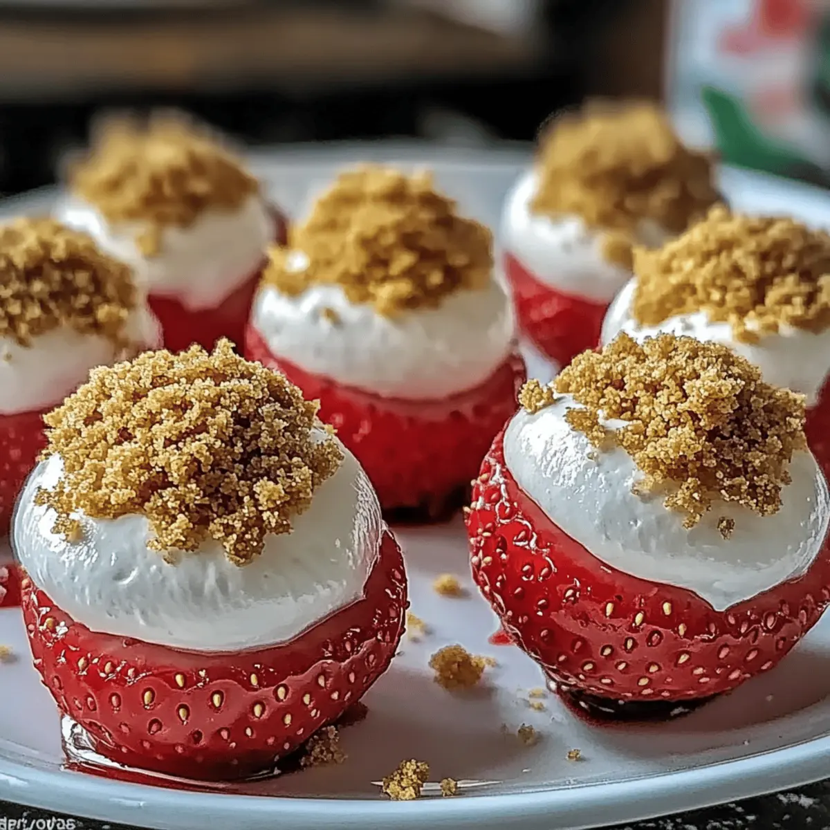 For a classic touch, sprinkle ½ cup of graham cracker crumbs over the filled strawberries, ensuring an even coating that mimics traditional cheesecake crust. If desired, drizzle melted chocolate over the top or add chopped nuts and colorful sprinkles for customization. Each topping enhances the flavor and visual appeal of your Cheesecake Strawberries Creamy Delight, making them more tempting.