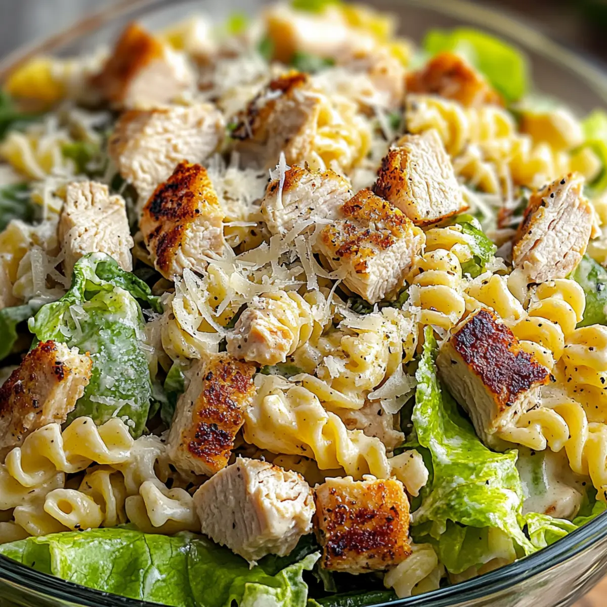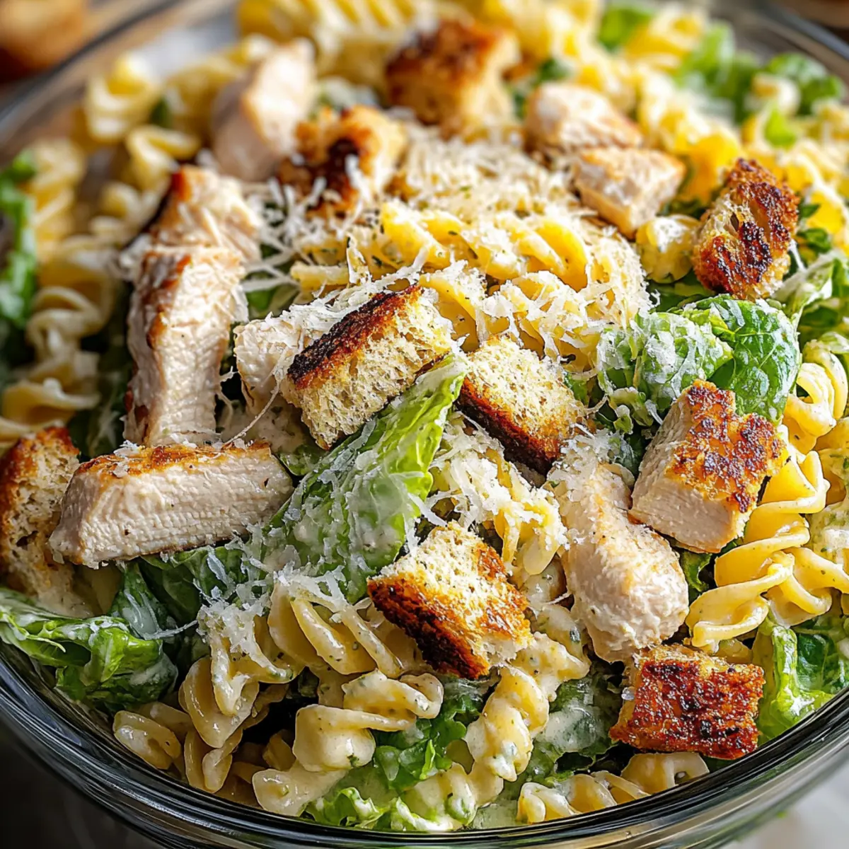 In the large bowl with the romaine, add the cooled pasta, sliced chicken, and a generous amount of your Caesar dressing. Toss everything together gently yet thoroughly so that the pasta, chicken, and lettuce are evenly coated in the creamy dressing. If you’re including croutons and additional Parmesan, fold those in as well to complete the Chicken Caesar Pasta Salad.