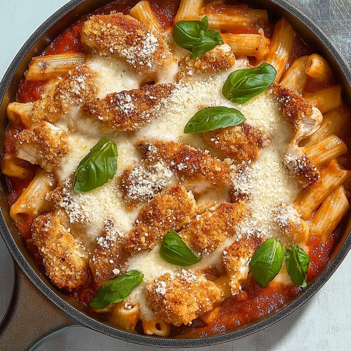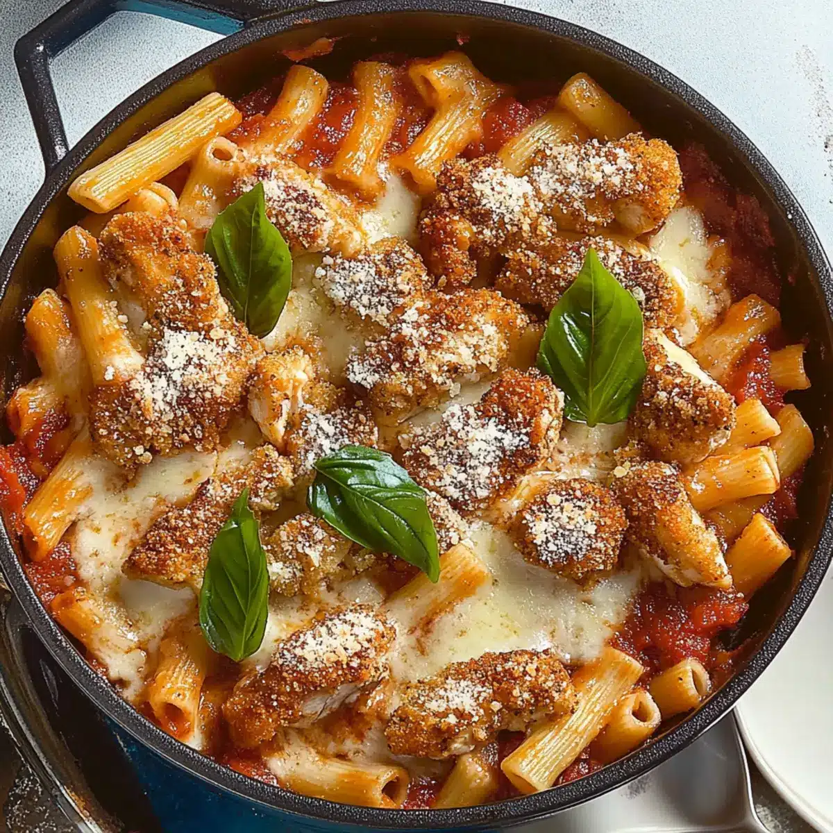 Absolutely! For Chicken Parm Pasta, I often suggest using cavatappi because its spiral shape holds the sauce beautifully. However, you can easily swap it with penne or fusilli if you prefer a different texture. Just ensure your pasta is short to blend perfectly with the chicken and sauce.