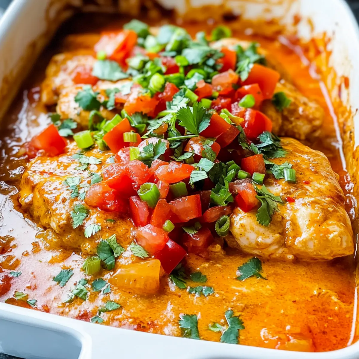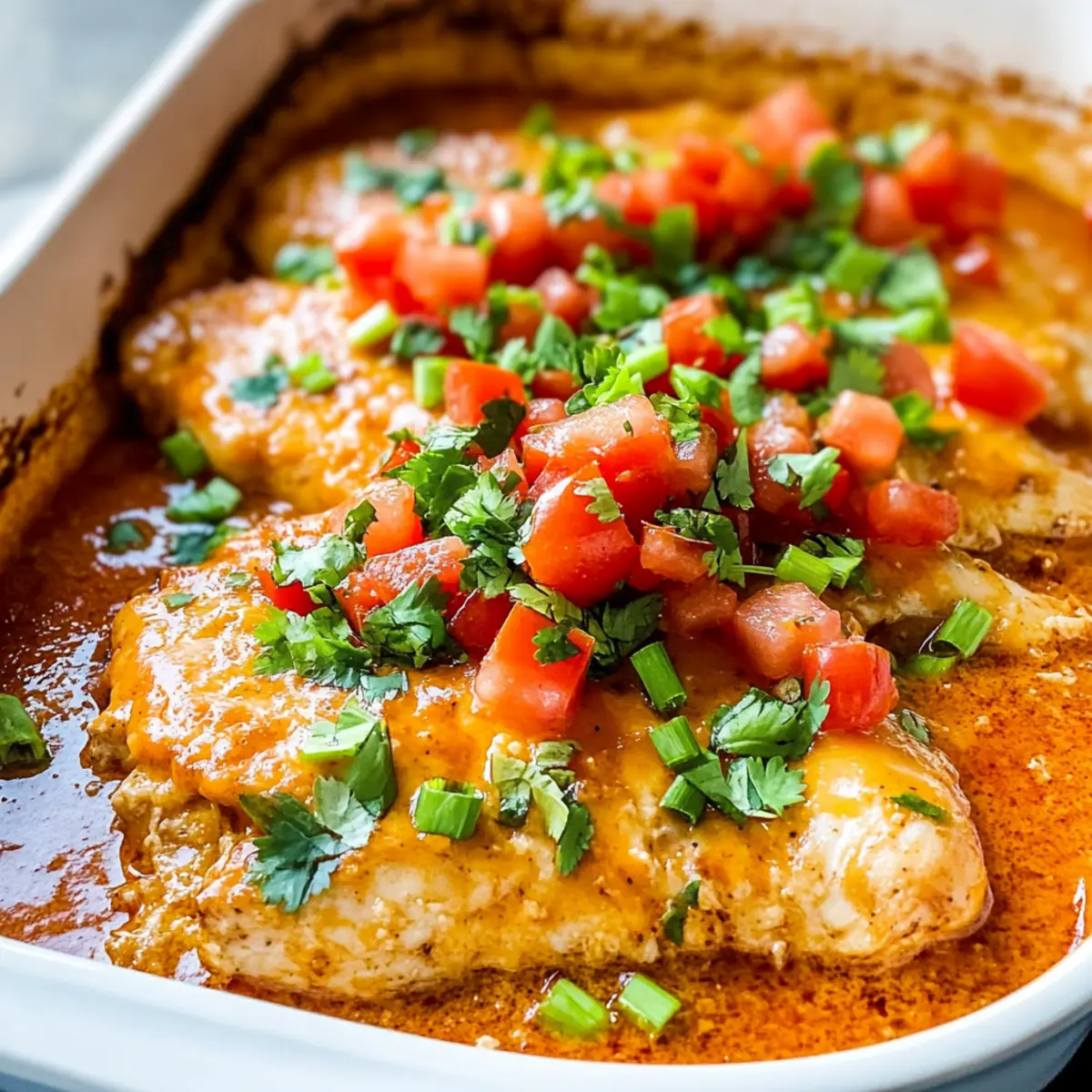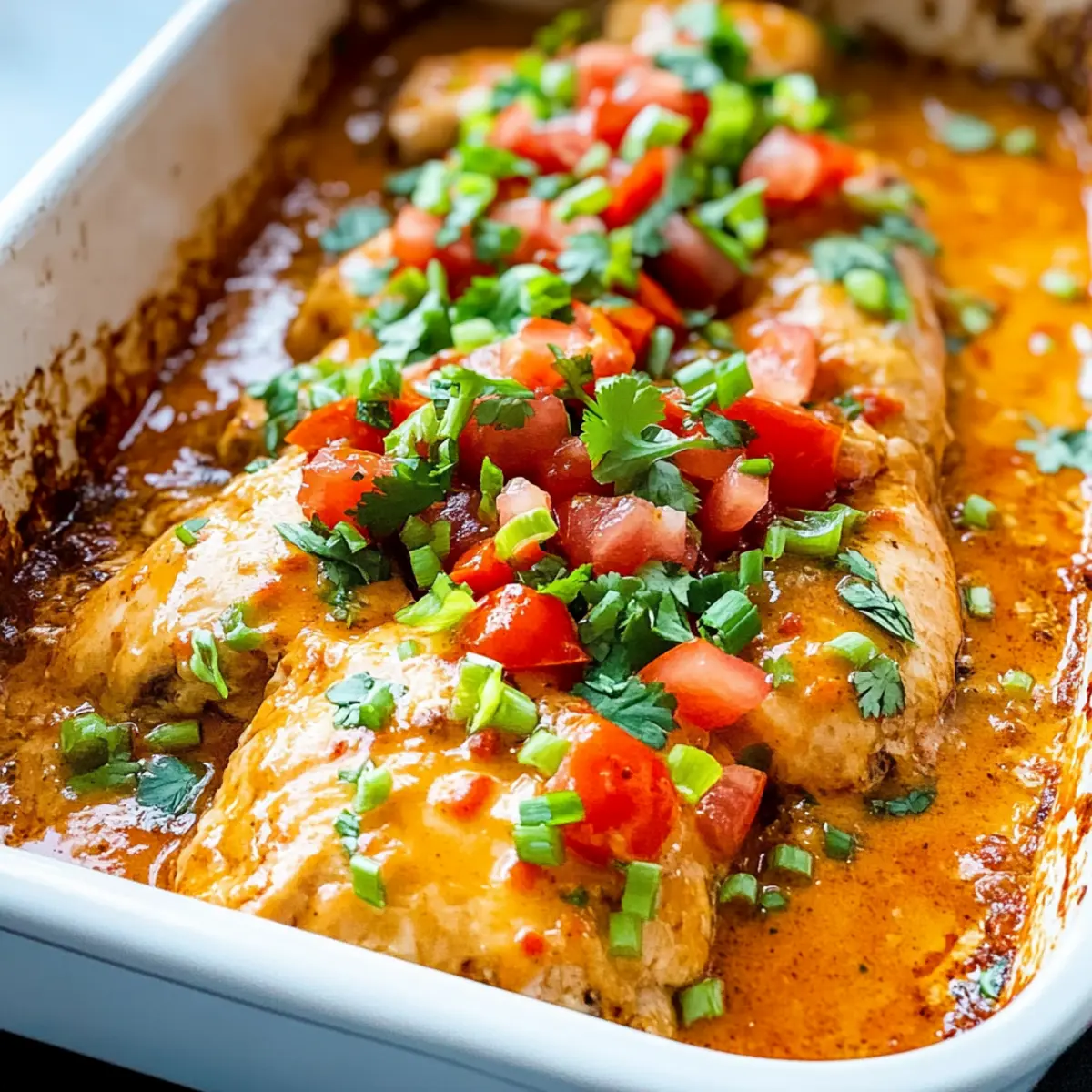 Once your Chile Con Queso Baked Chicken is cooked to perfection, remove it from the oven and let it rest for a few minutes. This will help the juices redistribute. Next, sprinkle fresh diced tomatoes, thinly sliced green onions, and chopped cilantro on top for a burst of brightness. Serve this comforting dish hot, accompanied by tortilla chips or over rice for a satisfying meal!