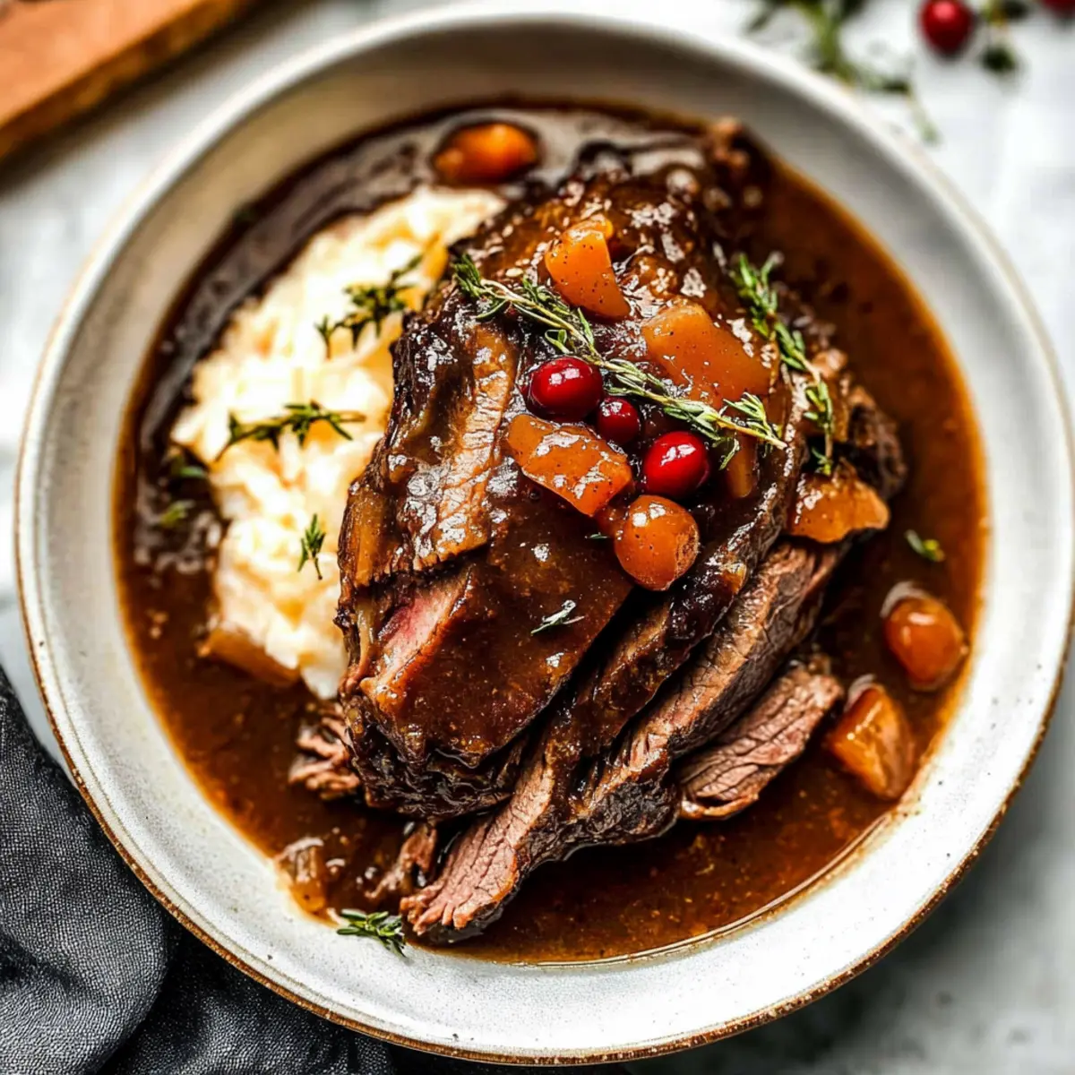 Slice the rested beef against the grain and arrange it on a warm serving platter. Generously ladle the luscious red wine gravy over the beef, garnishing with fresh rosemary sprigs and a sprinkle of red currants or cranberries for a festive touch. Your beautifully presented Christmas Roast Beef with Red Wine Gravy is now ready to impress your guests!