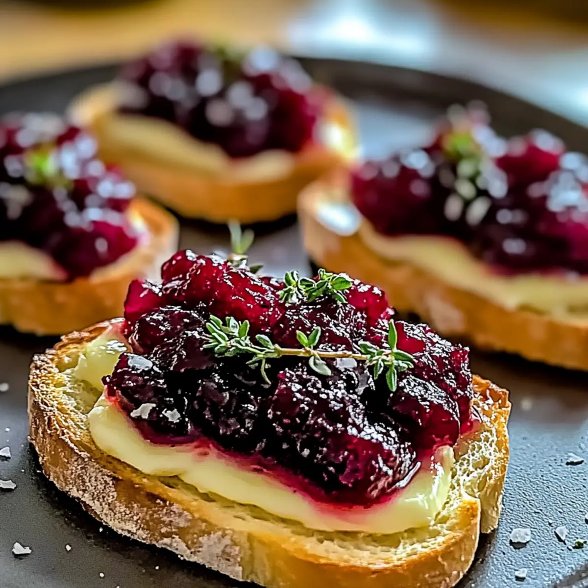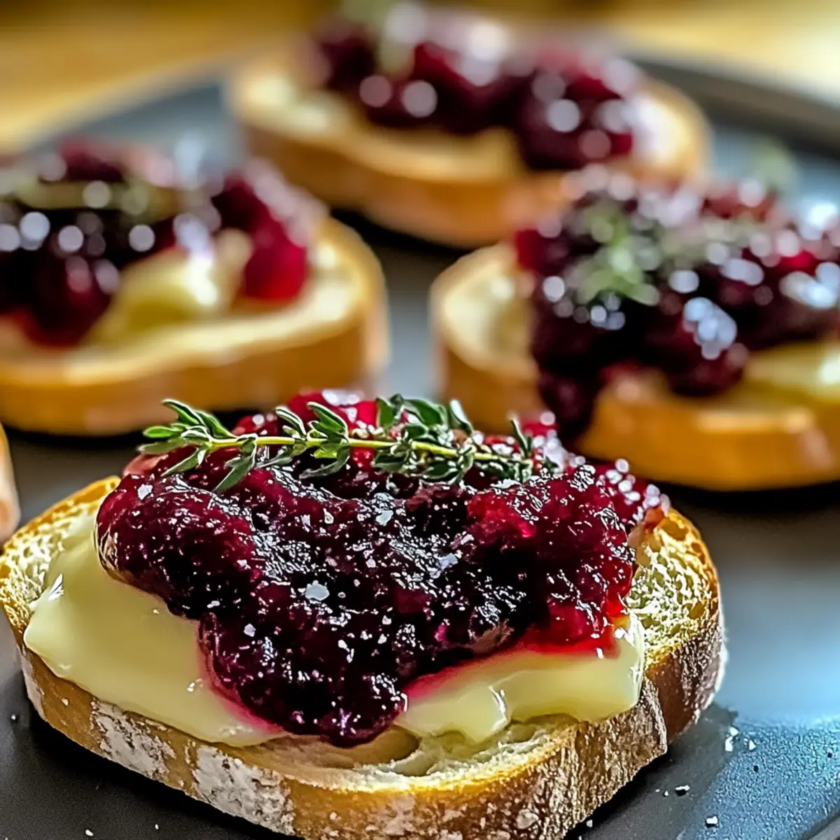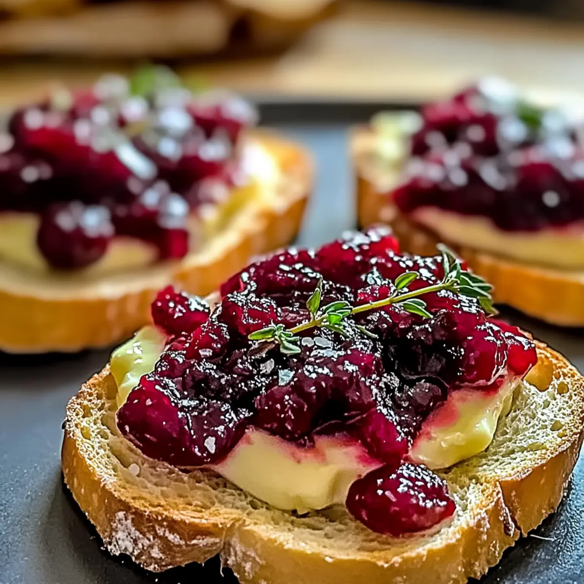 After the Brie has melted perfectly, take the crostini out of the oven. Spoon generous dollops of cranberry sauce atop each one, allowing the sweet-tart flavor to complement the rich cheese. This creates a vibrant contrast that will tantalize the taste buds.