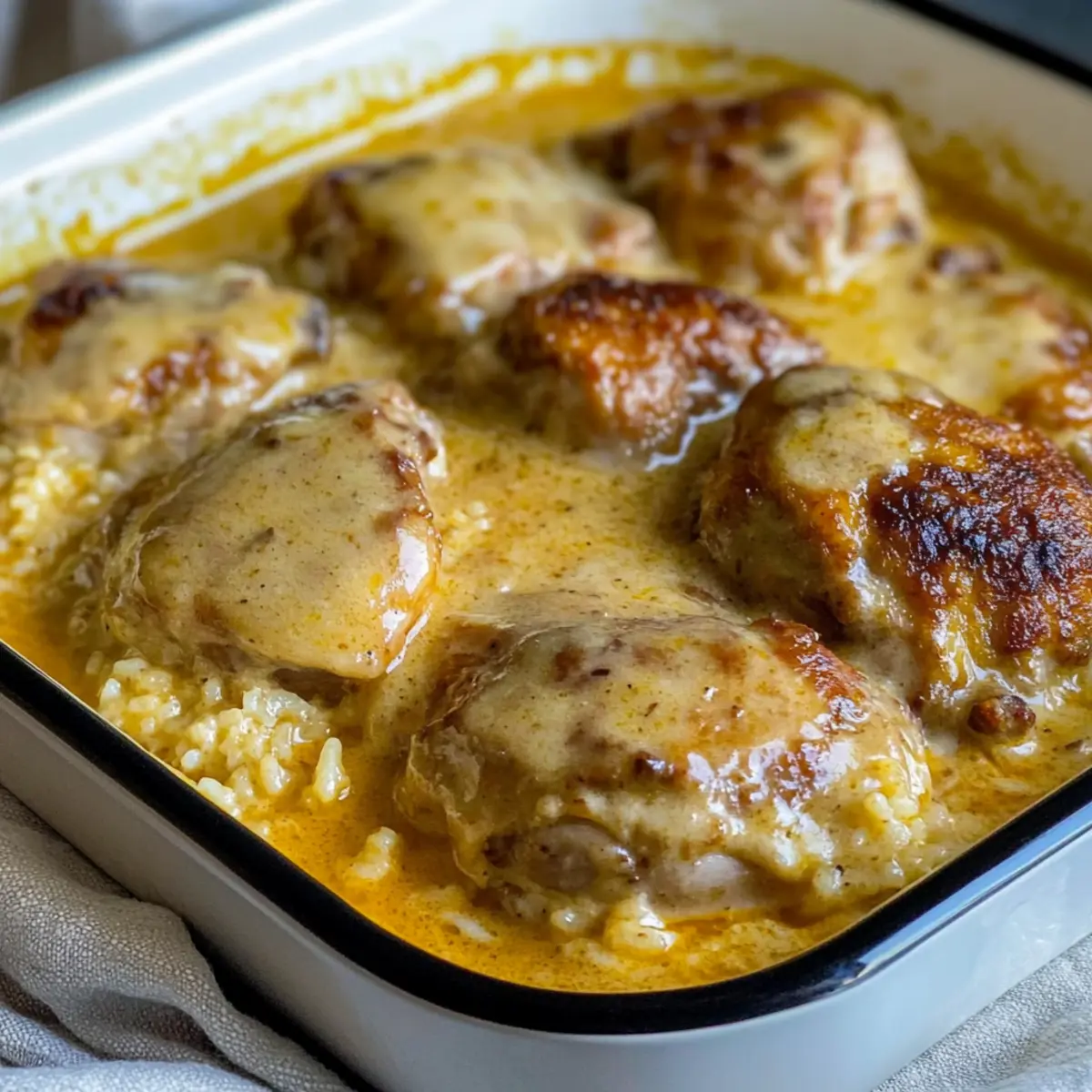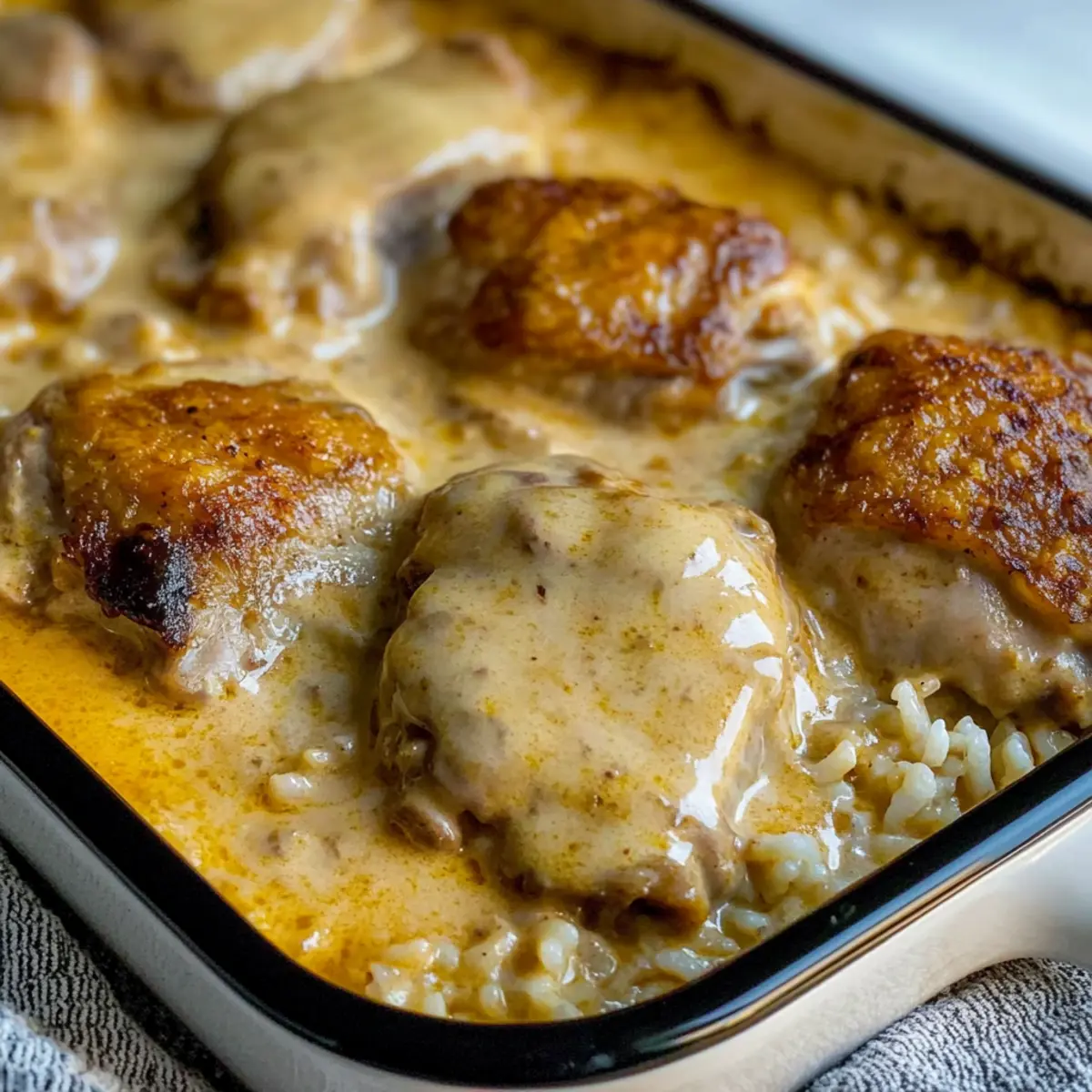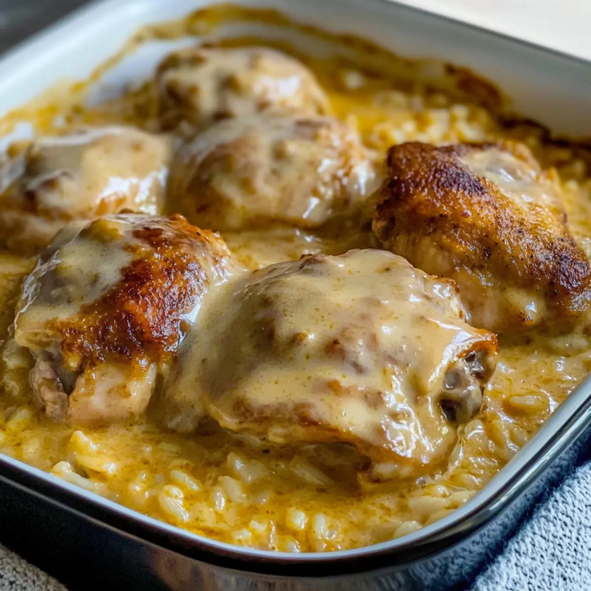 Now, pour the creamy soup mixture over the chicken evenly, covering them entirely. The sauce should cascade down over the chicken and rice, creating a beautiful, creamy ocean of flavor. This step is vital to ensure that the rice absorbs all the delicious goodness while baking.
