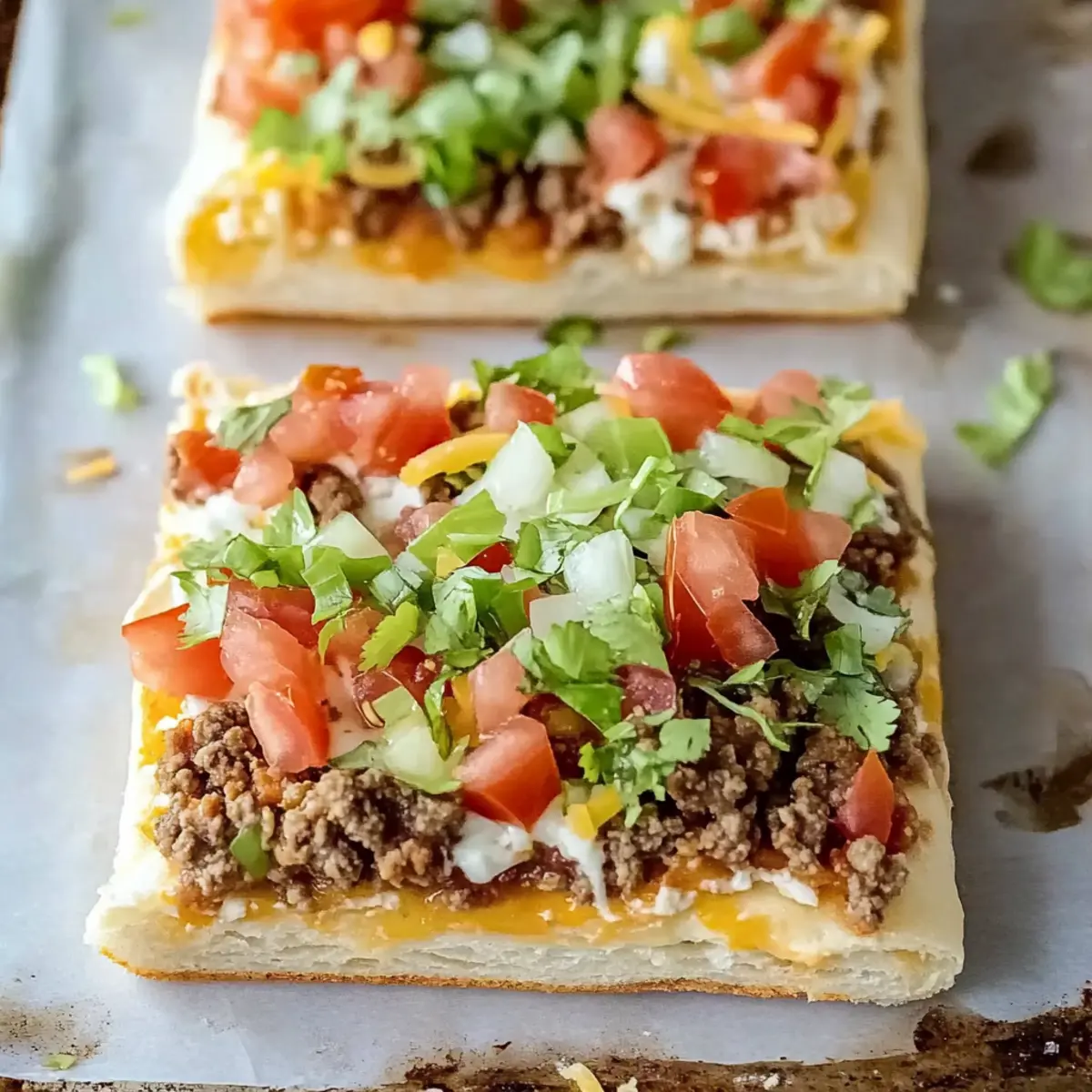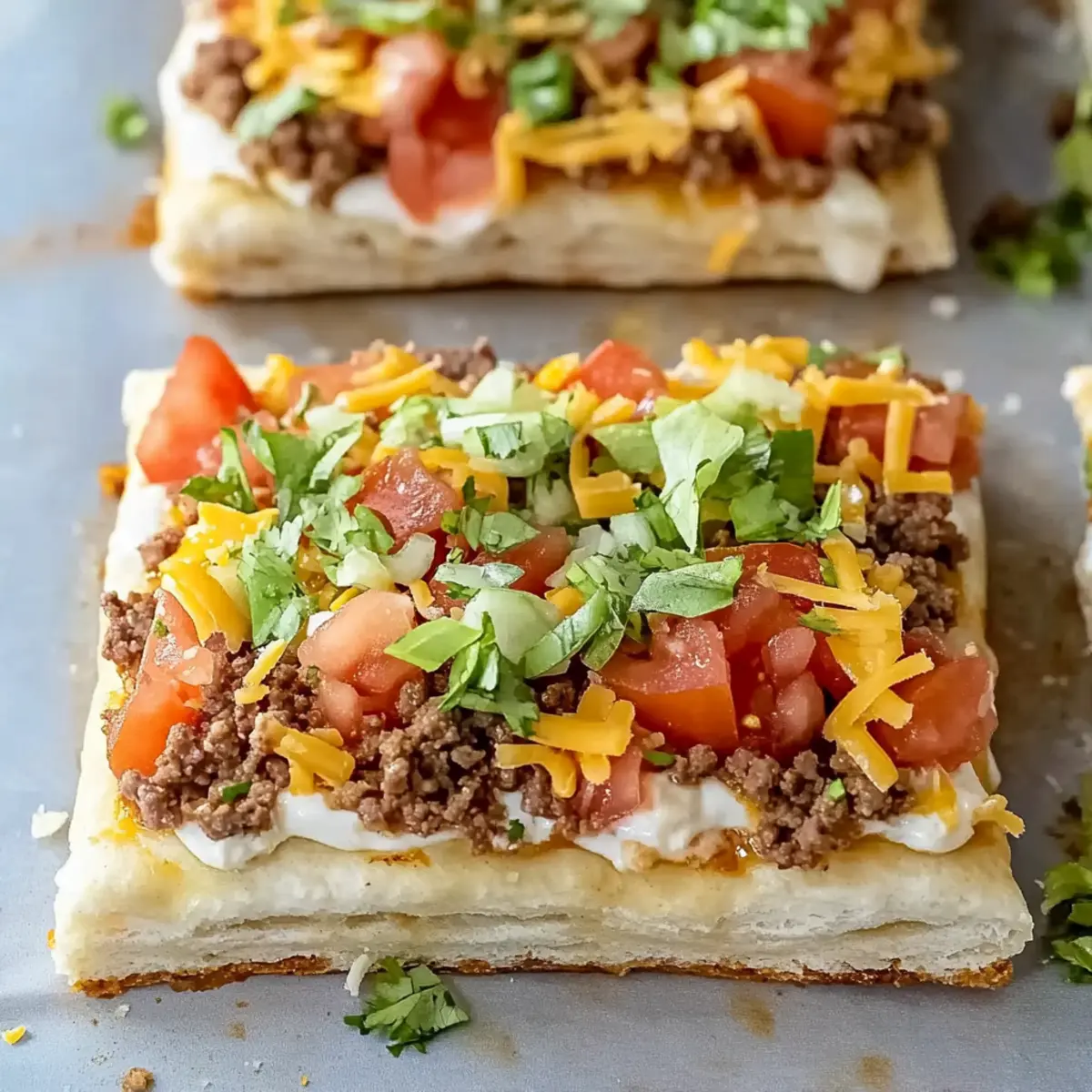 These Easy Crescent Roll Taco Pizza slices are perfect for meal prep! You can prepare the ground beef and cream cheese mixture up to 24 hours in advance, storing them in separate airtight containers in the refrigerator to maintain freshness. The crescent roll crust can be baked and stored at room temperature overnight; just wrap it tightly to keep it crisp. When you’re ready to serve, simply reassemble the layers, spread the creamy sauce over the cooled crust, top with the taco meat, tomatoes, and cheese, and bake for about 10 minutes until warmed through and the cheese is melted. This way, you’ll enjoy a delicious, homemade meal with minimal fuss on busy weeknights!