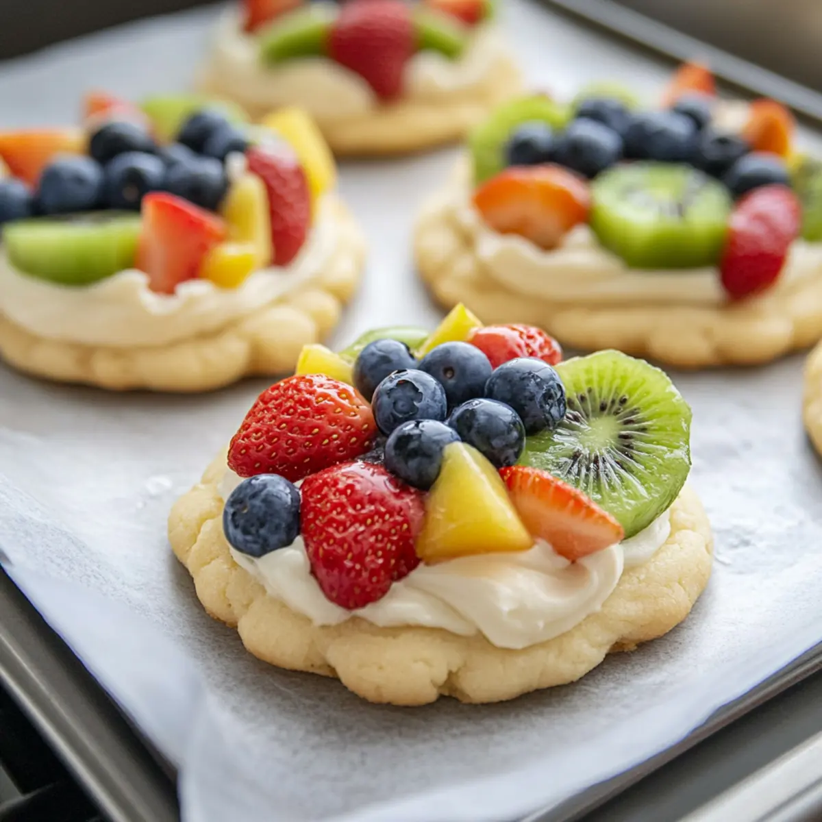 Preheat your oven to 350°F (175°C). While it warms up, prepare your baking sheets by lining them with parchment paper or lightly greasing them with cooking spray to prevent any sticking. This will ensure your Fruit Pizza Cookies bake evenly and come off the sheets easily once they’re done.