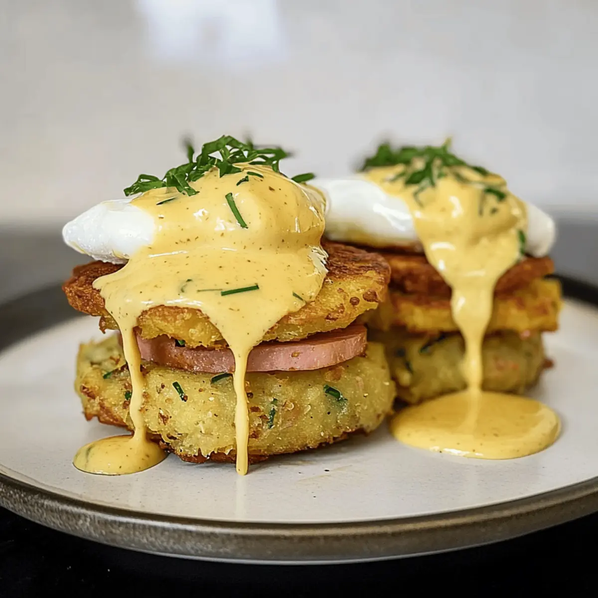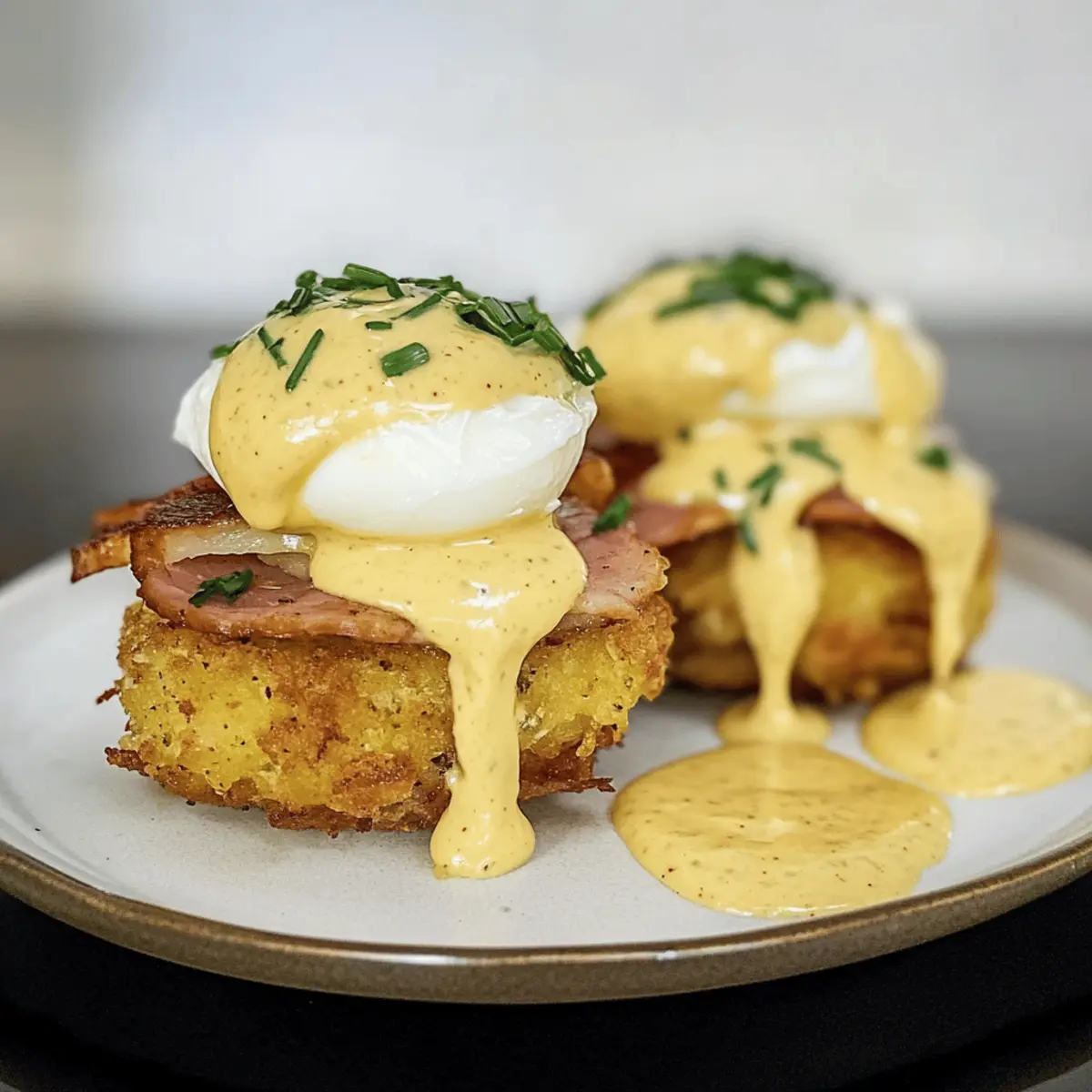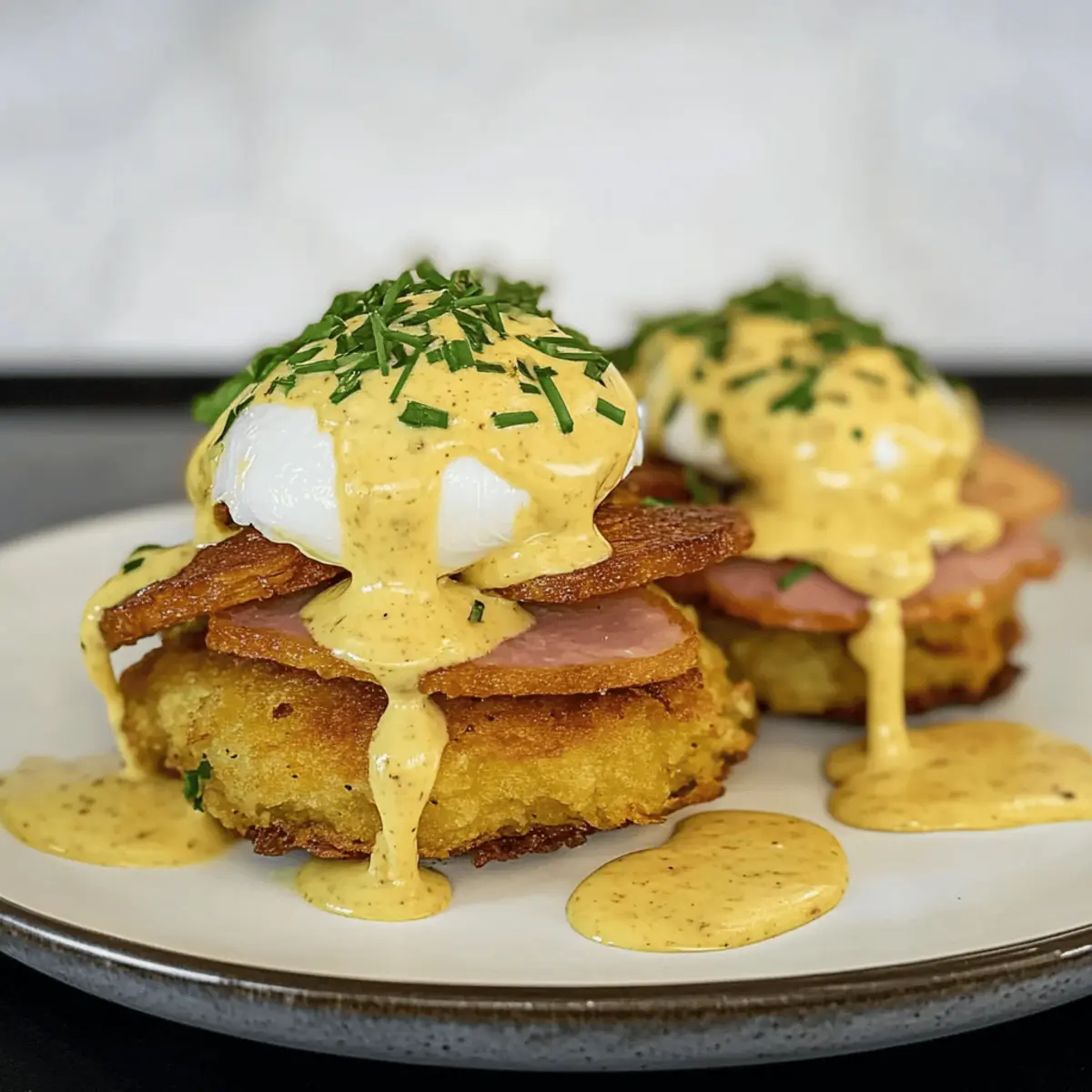 To plate your Hash Brown Eggs Benedict, start with a crispy hash brown patty as the base, followed by a slice of savory ham. Carefully place your poached egg on top, and drizzle generously with the rich hollandaise sauce. For a finishing touch, sprinkle freshly chopped chives over the top, and your delightful brunch dish is ready to impress!