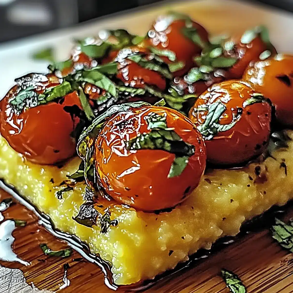 - Once the polenta is cooked, stir in 2 tablespoons of butter and your chosen chopped fresh herbs, mixing well to infuse the flavors. Spread the herbed polenta evenly in a greased baking dish. Layer the blistered tomatoes on top and drizzle with a bit more olive oil.