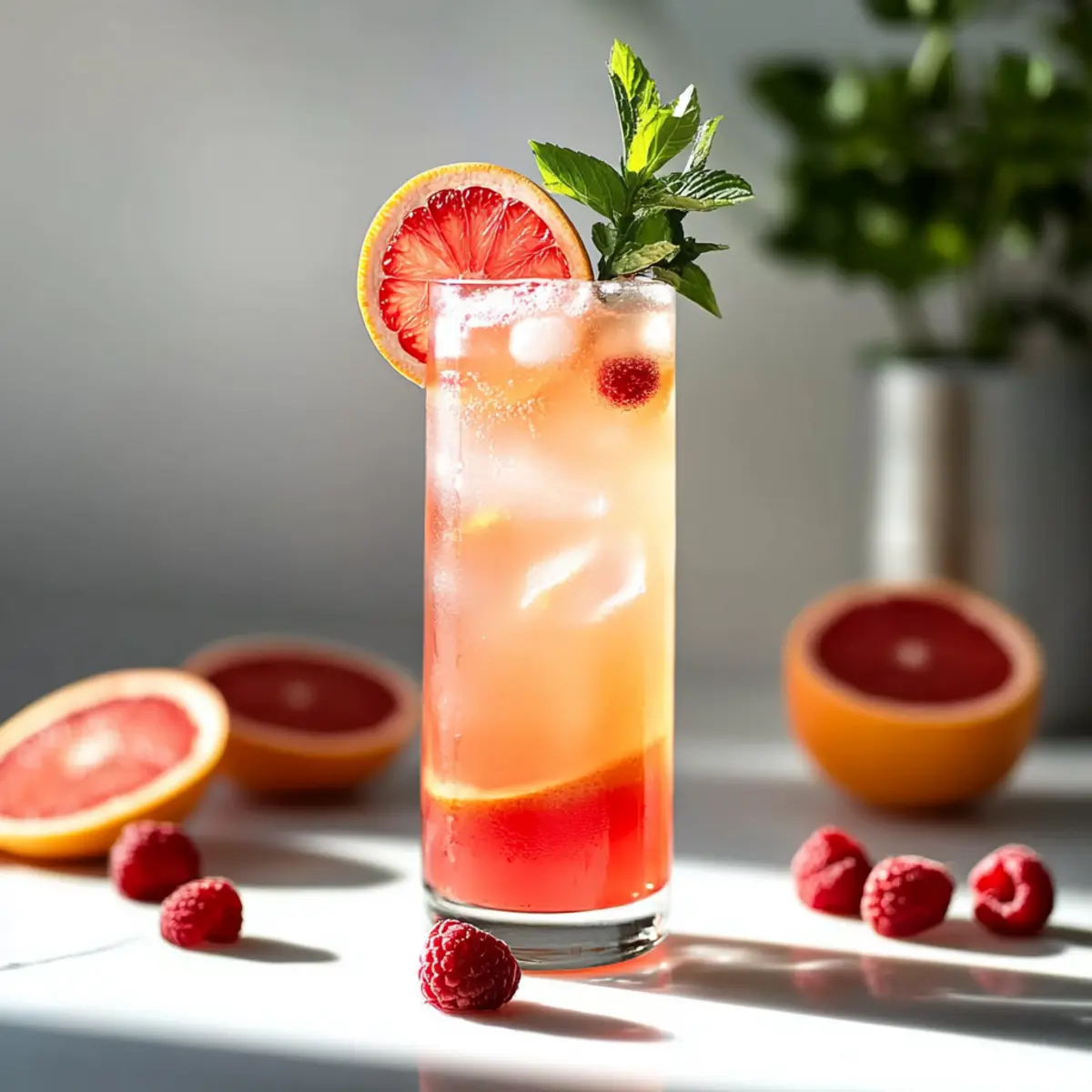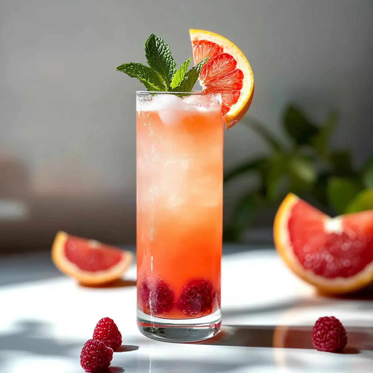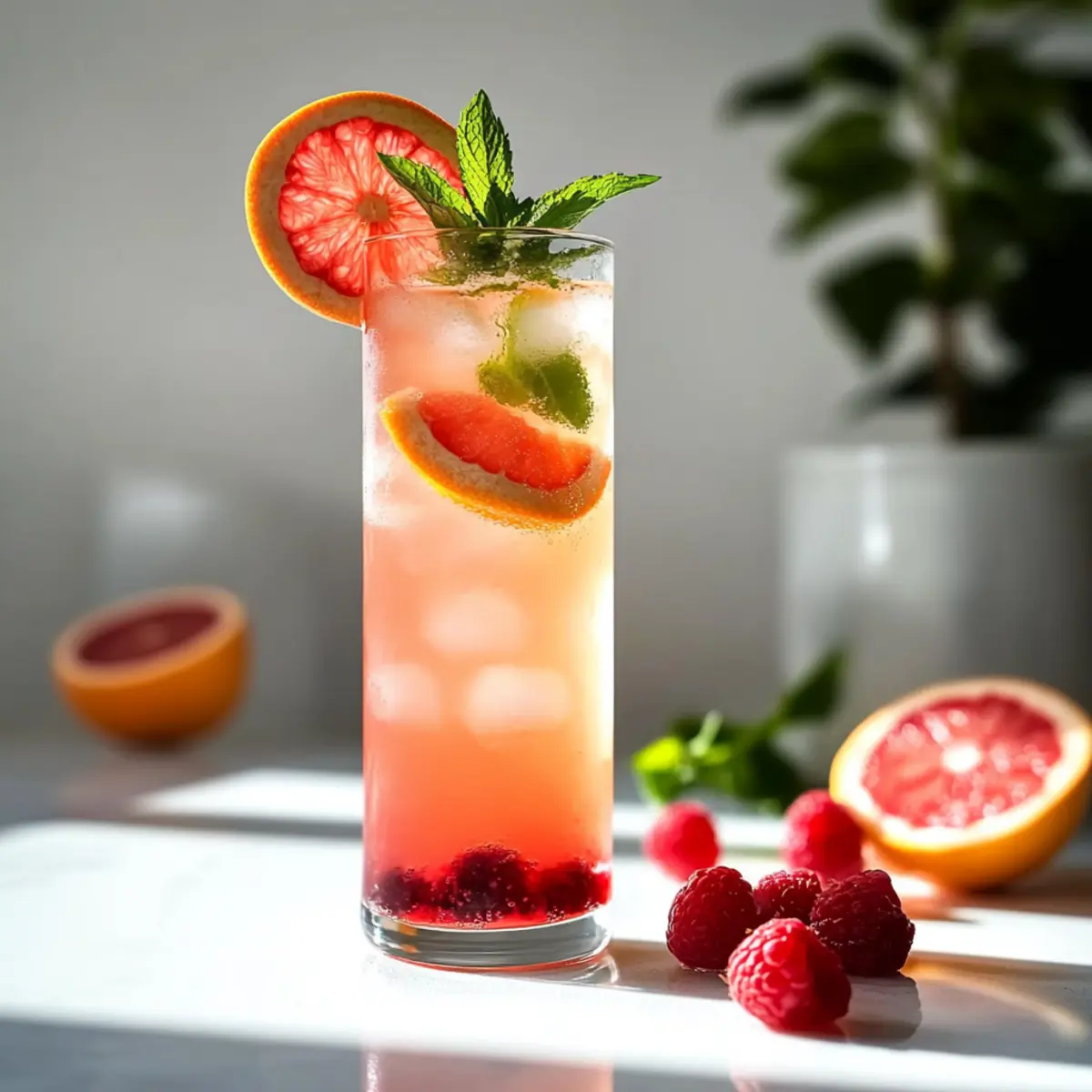 - Garnish with a slice of grapefruit, whole raspberries, and a sprig of fresh mint.