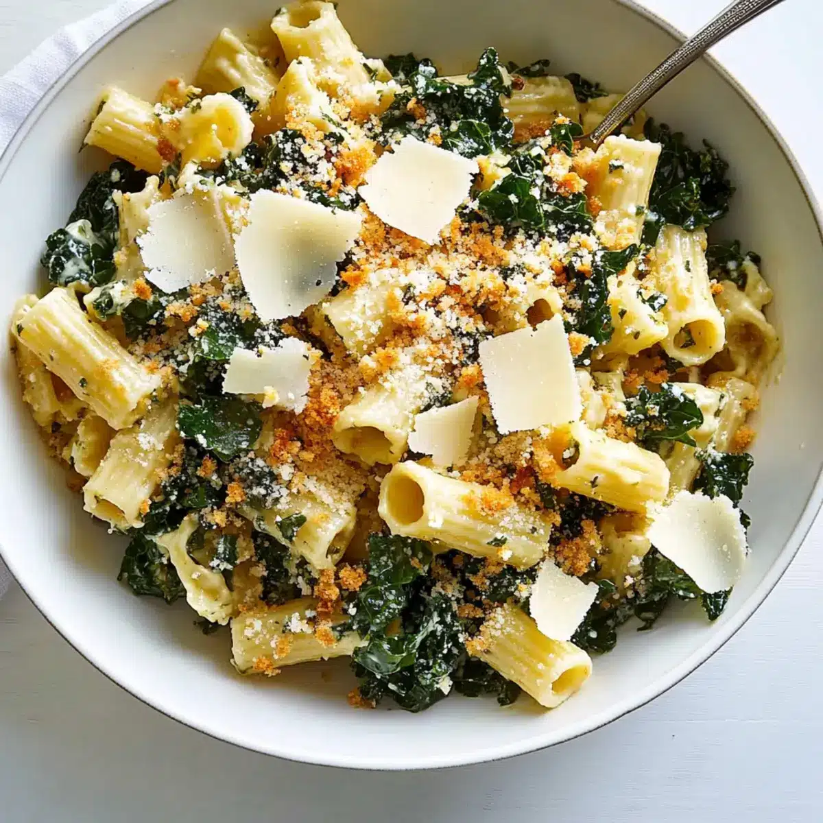Before serving, take the salad out of the fridge and give it a gentle stir. Add the shavings of Parmesan and half of the crispy breadcrumbs, mixing them lightly into the salad. Serve the Kale Caesar Pasta Salad in a large bowl, garnished with the remaining breadcrumbs on top for that crunchy finish, allowing everyone to enjoy this refreshing, creamy dish!