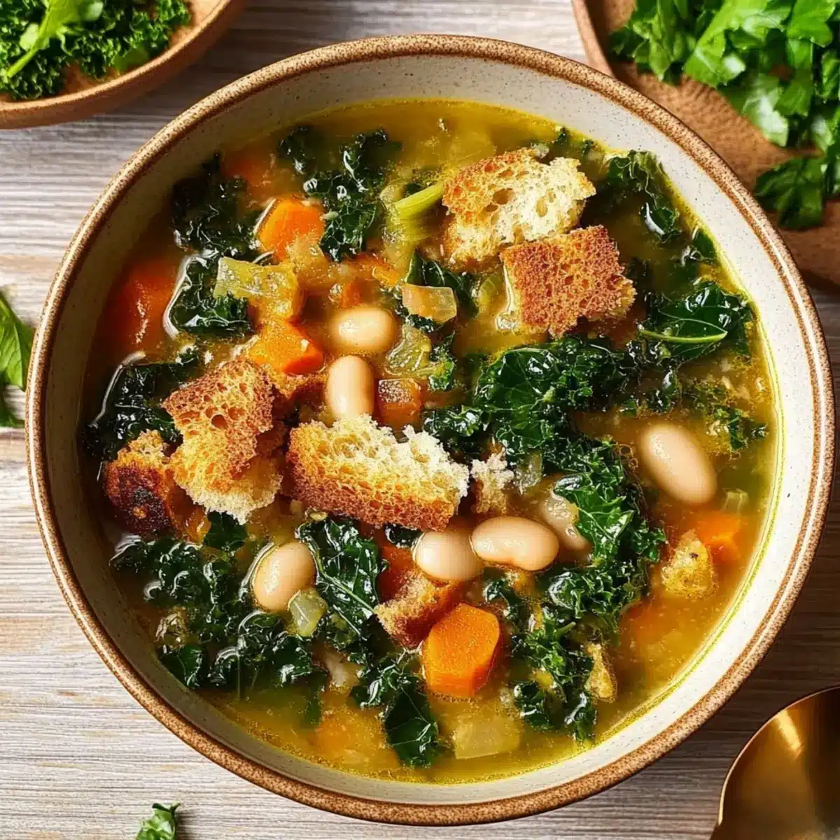 Ladle the kale soup into bowls, then top generously with homemade croutons and a sprinkle of fresh parsley. Drizzle a little extra olive oil on top for good measure. Each bowl is now ready to bring warmth and comfort to your table, inviting everyone to indulge in this hearty masterpiece.