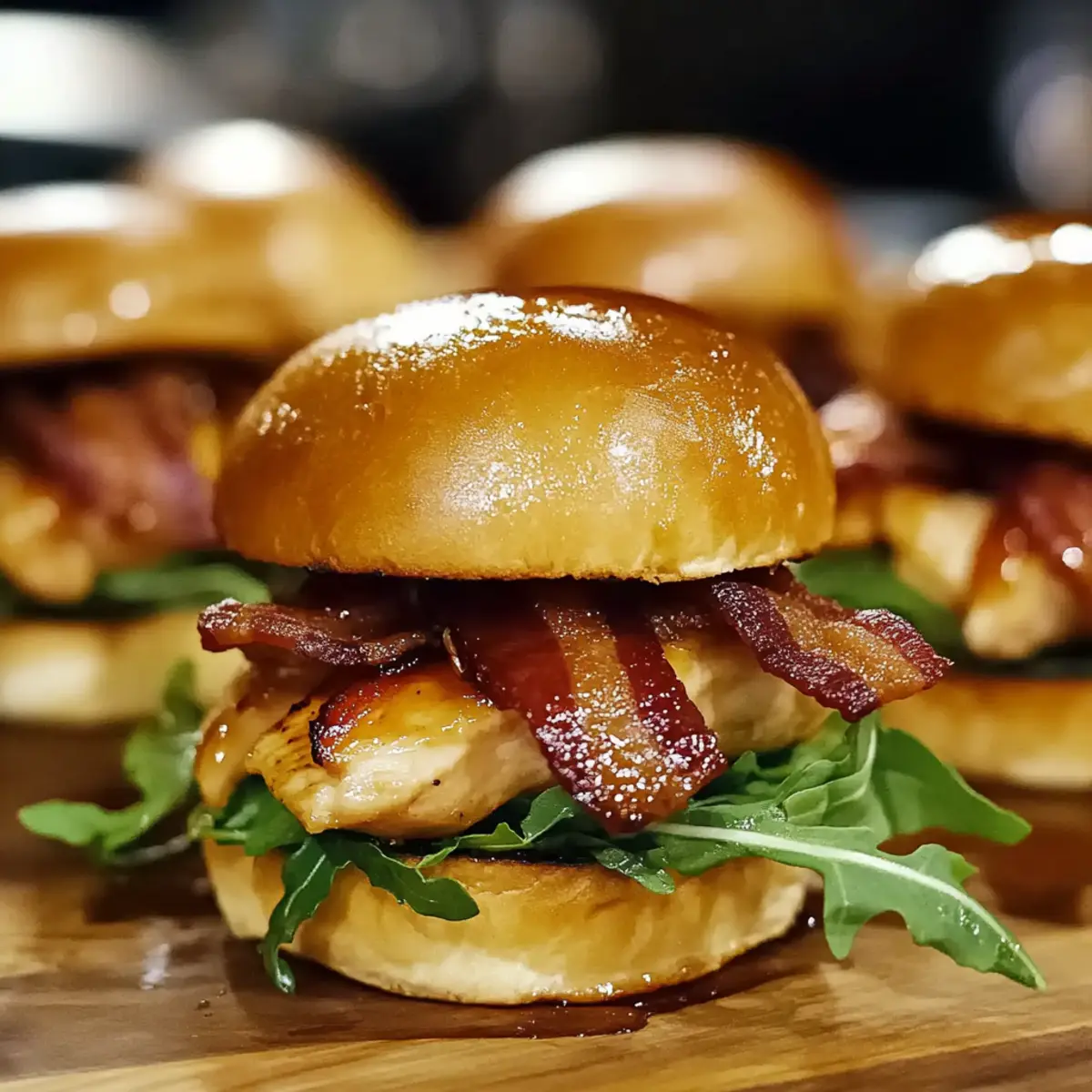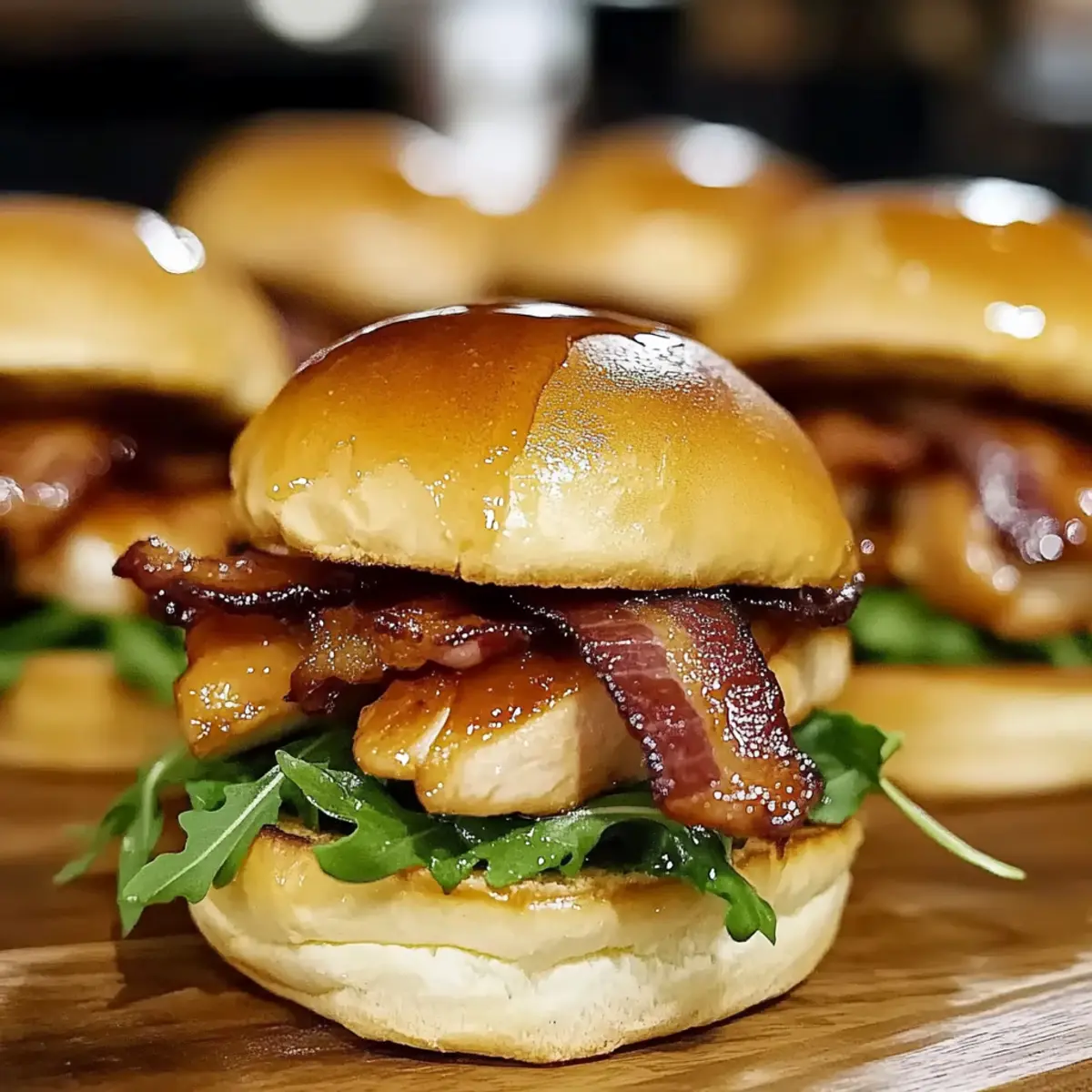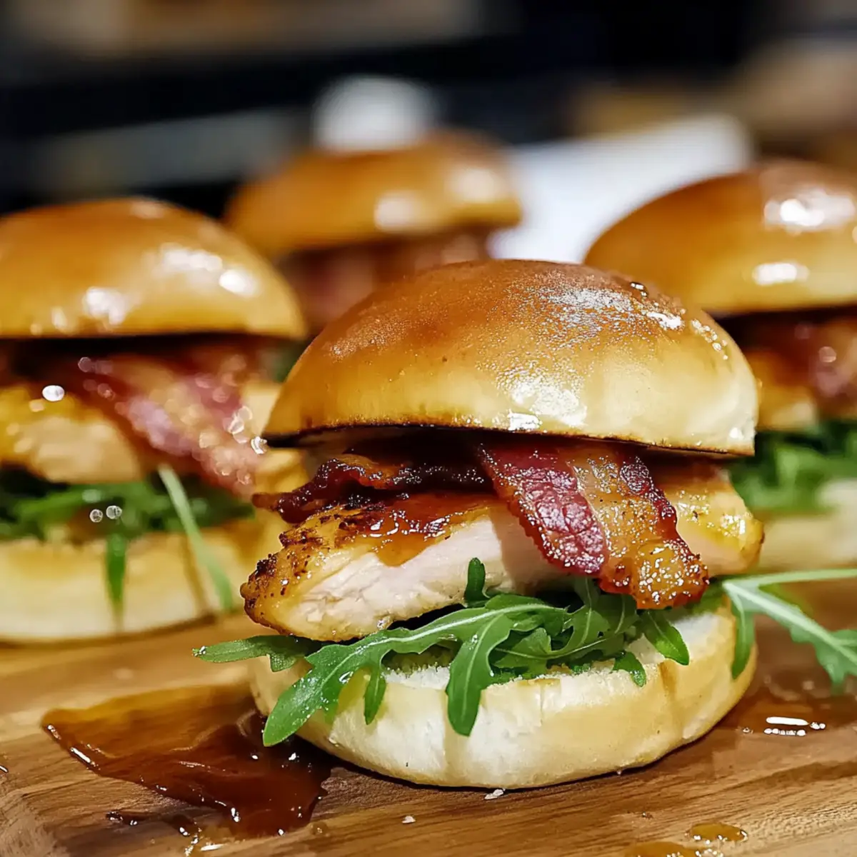 While the chicken is cooking, toast your slider buns lightly on a separate skillet or grill until they are golden and warm. Once the chicken is cooked, slice each breast into smaller pieces to fit the buns. Layer the warm buns with the chicken, a crispy slice of beef bacon, and a handful of fresh arugula for a lovely crunch.