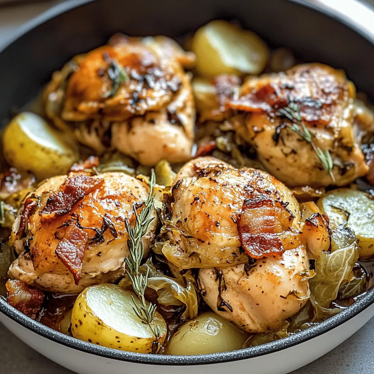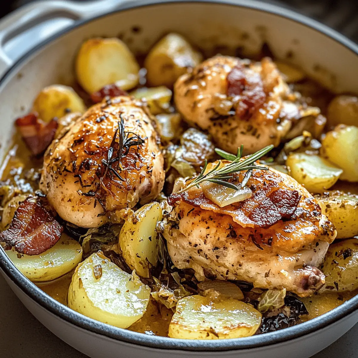 - Layer the chicken pieces at the bottom of a large oven-safe pot, followed by the bacon, potatoes, and cabbage.
