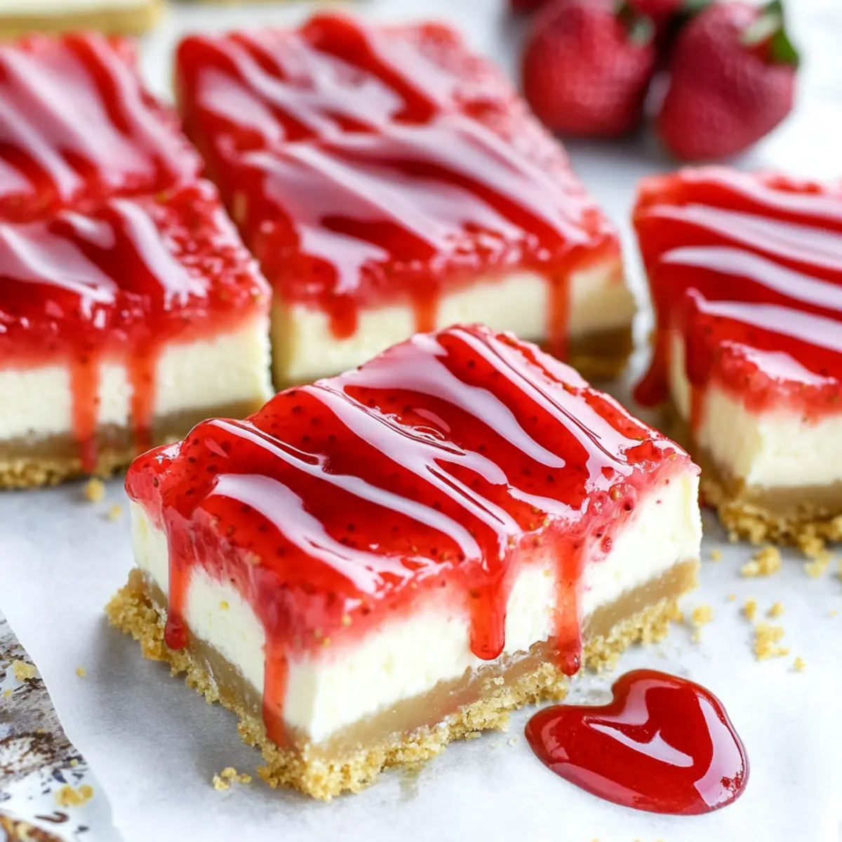 Freezer: For longer storage, freeze the cheesecake bars for 2-3 months without the topping. Before serving, allow them to thaw in the fridge and add the strawberry sauce fresh.