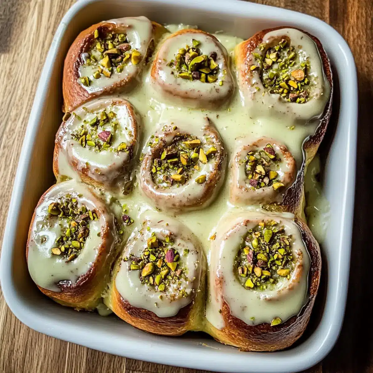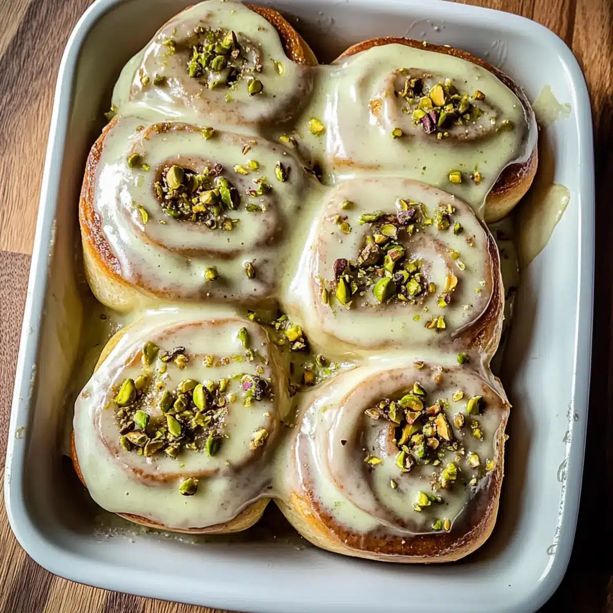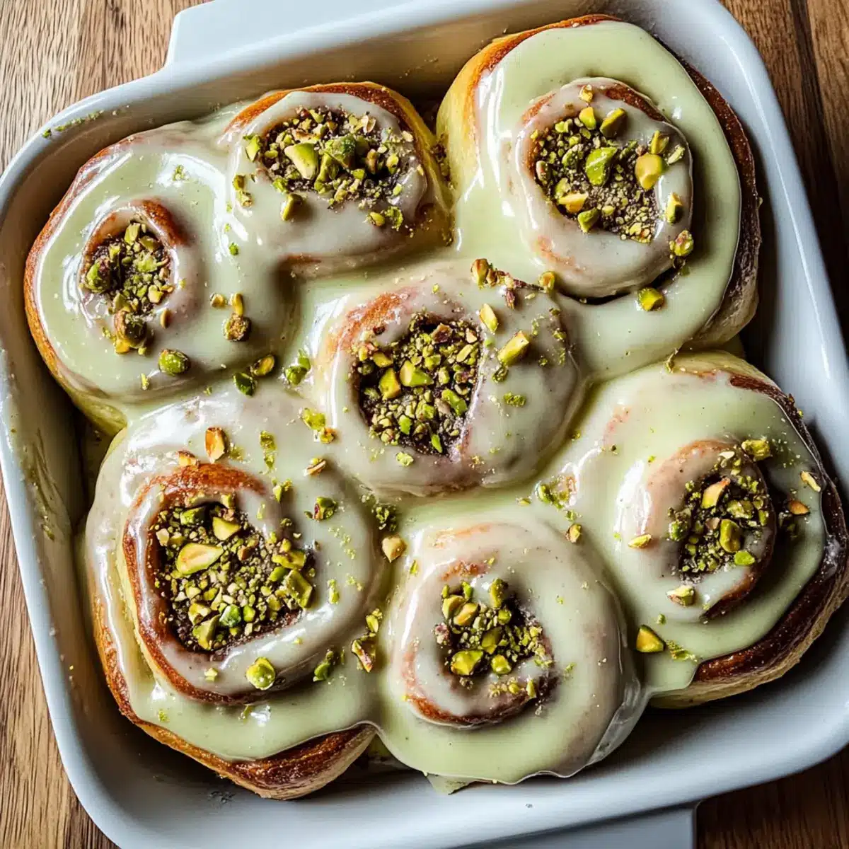 - Ice & Serve: Spread icing over rolls and garnish with chopped pistachios before serving.