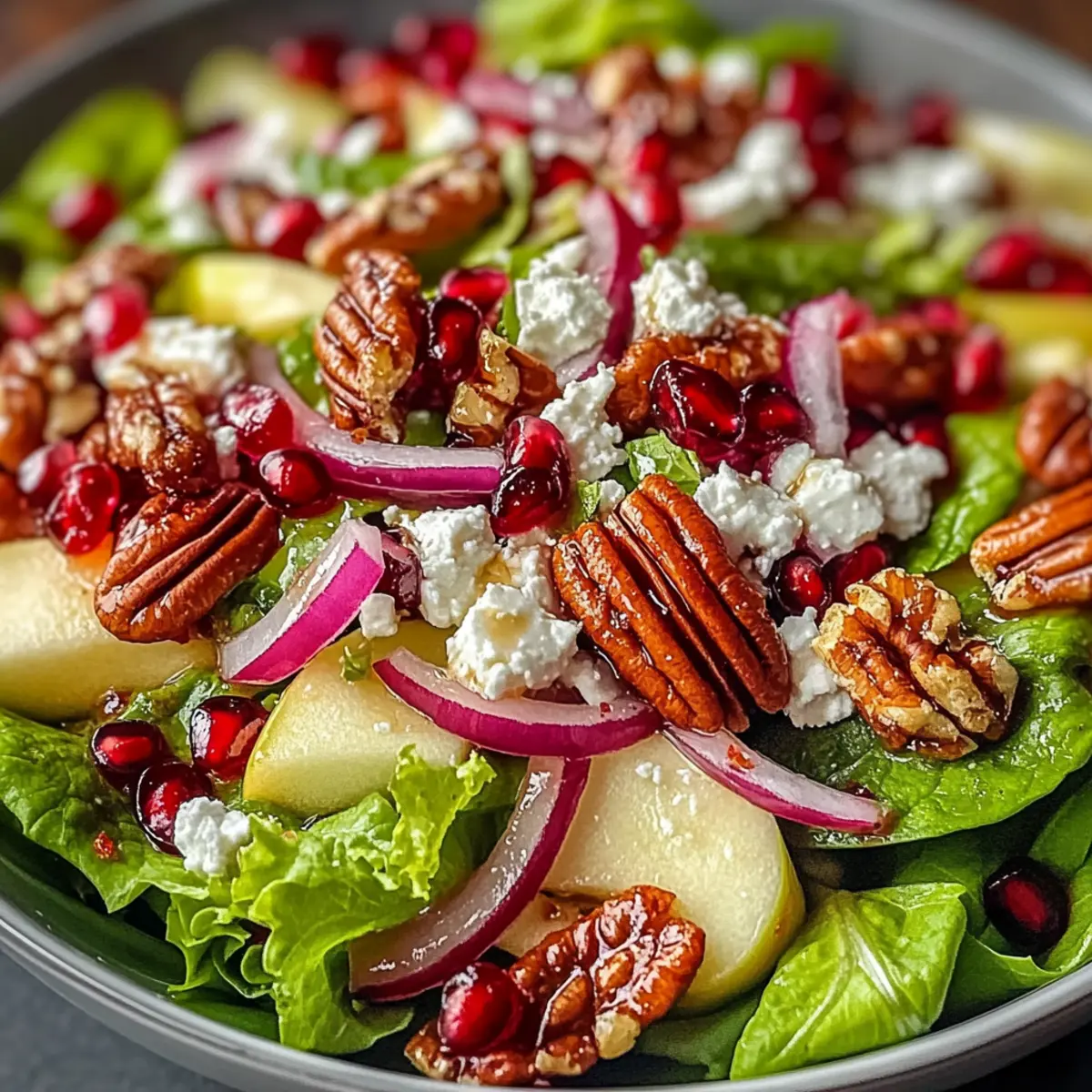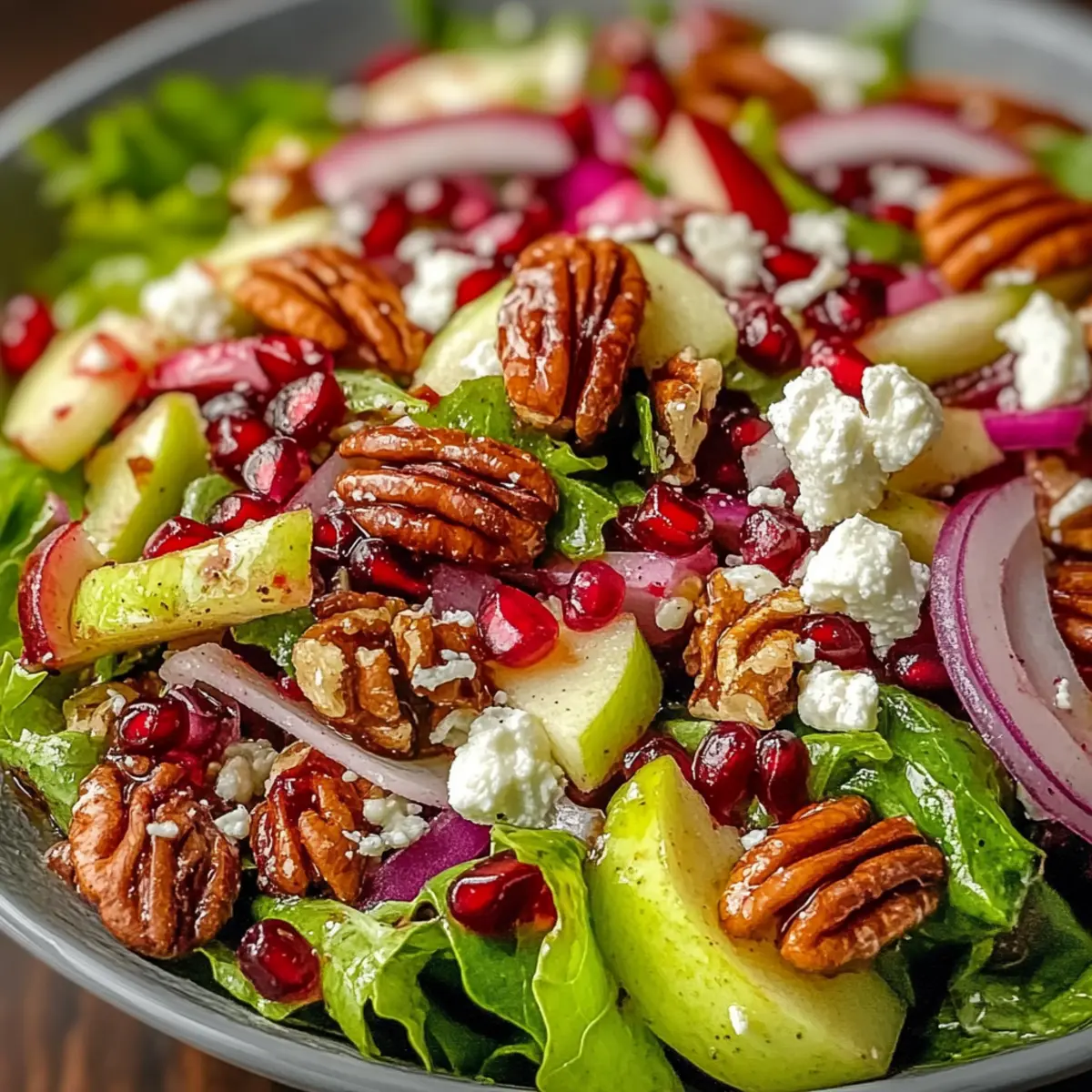 - In a large salad bowl, add mixed salad greens as the base. Top with pomegranate seeds and toasted pecans, followed by crumbled feta, red onion, and apple slices. Toss gently to combine.