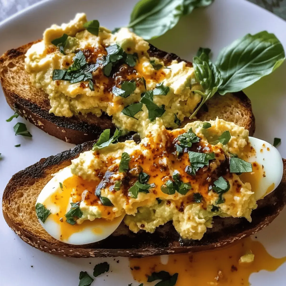 - Spoon cheesy egg mixture on top of avocado toast and drizzle with chili garlic butter. Garnish with herbs if desired.