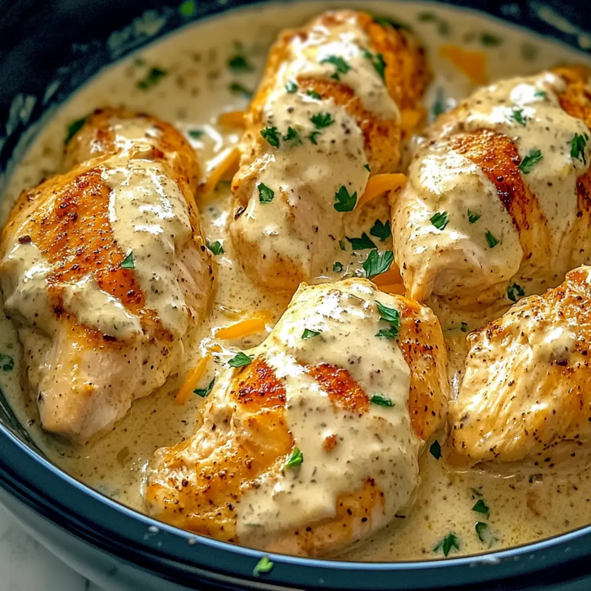 Carefully place the seared (or raw) chicken breasts into the crockpot, ensuring they are fully coated in the creamy sauce. If you’re using frozen chicken breasts, just make sure they’re submerged in the sauce as it cooks. This will help infuse the flavors throughout the chicken as it cooks to tender perfection.