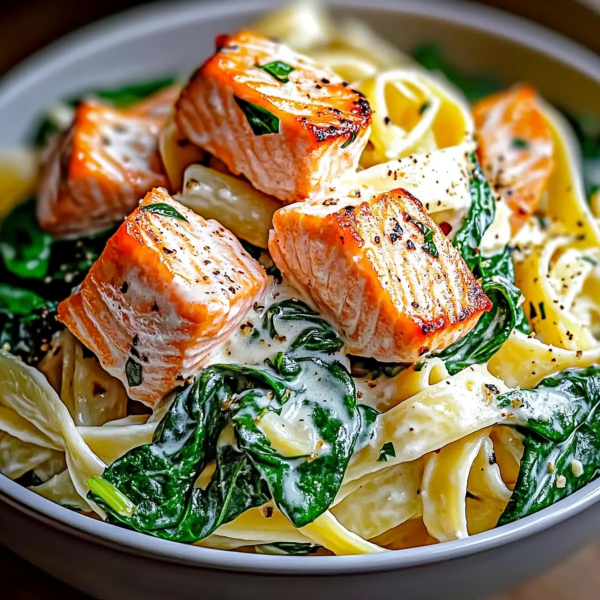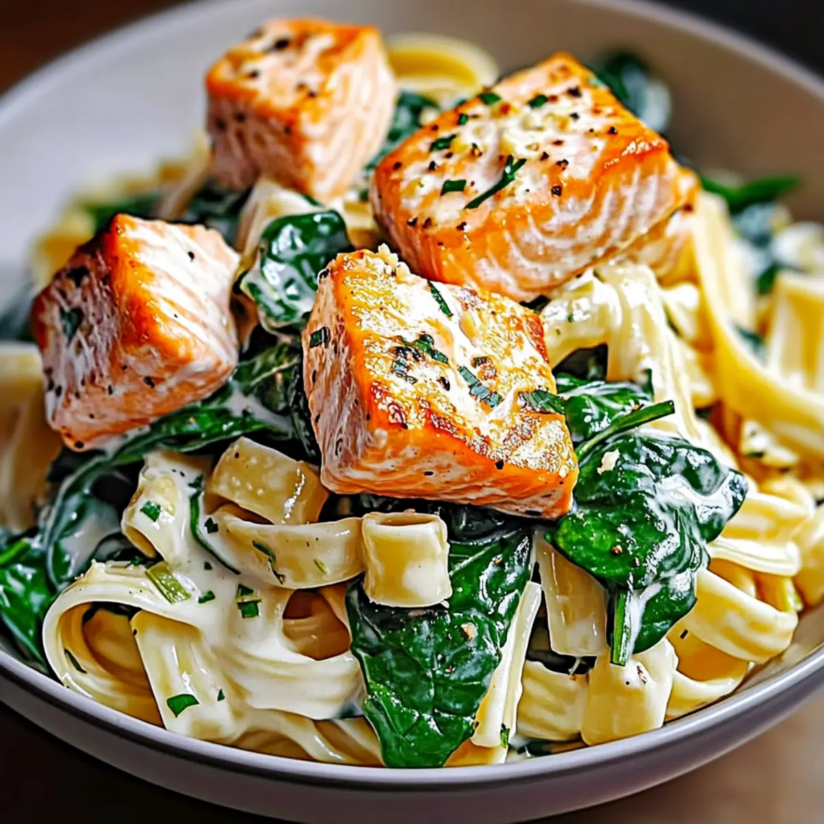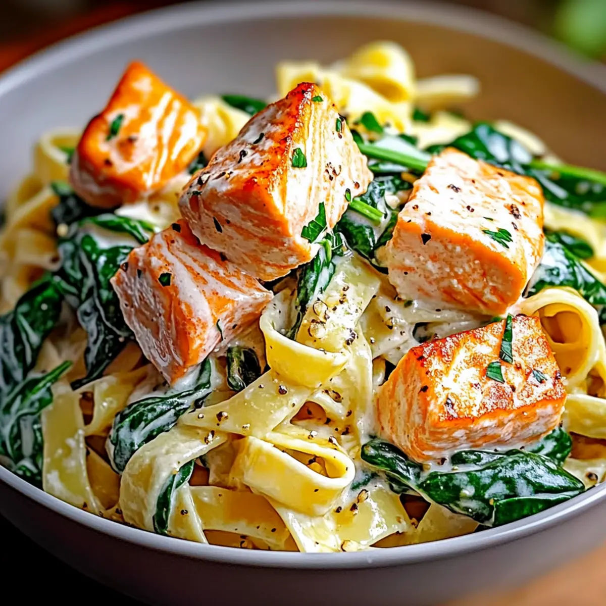 - Spoon the creamy salmon spinach pasta onto plates, garnishing with chopped fresh parsley. Enjoy!