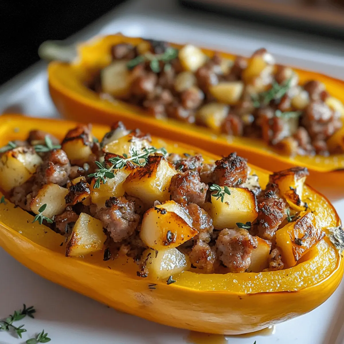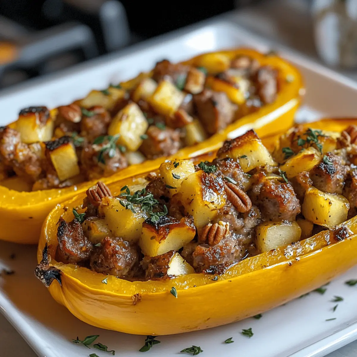 Remove the stuffed squash from the oven and let it sit for a couple of minutes. Garnish each half with a sprinkle of chopped pecans or walnuts for a delightful crunch, and a few fresh thyme leaves for a pop of color and flavor. Serve warm to enjoy this comforting Sausage and Apple Stuffed Honeynut Squash with family and friends.