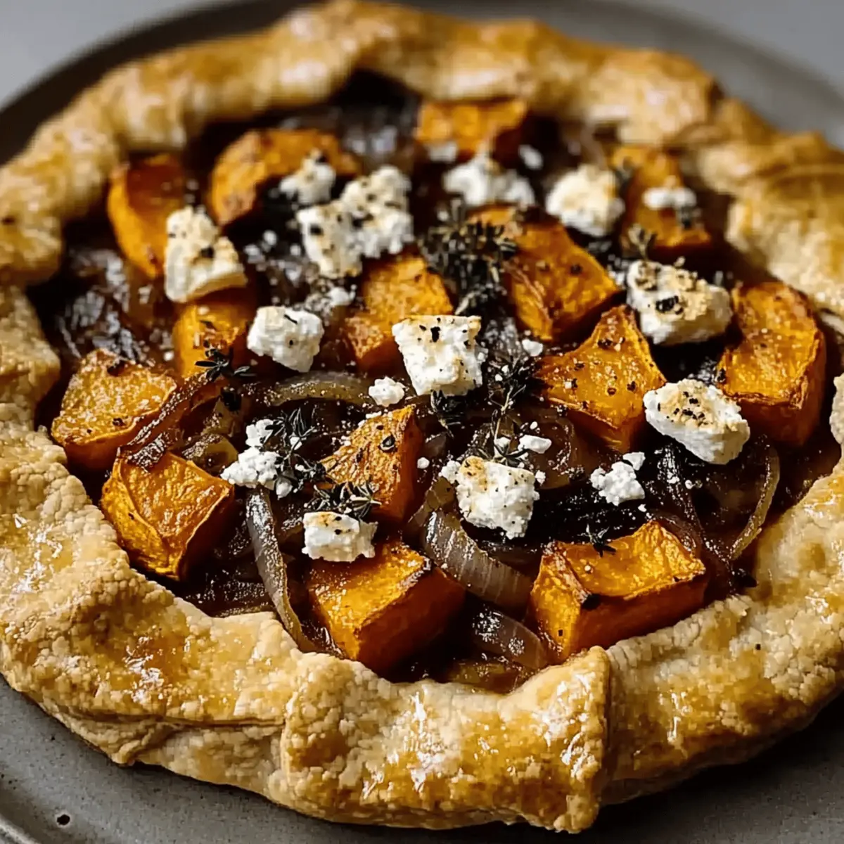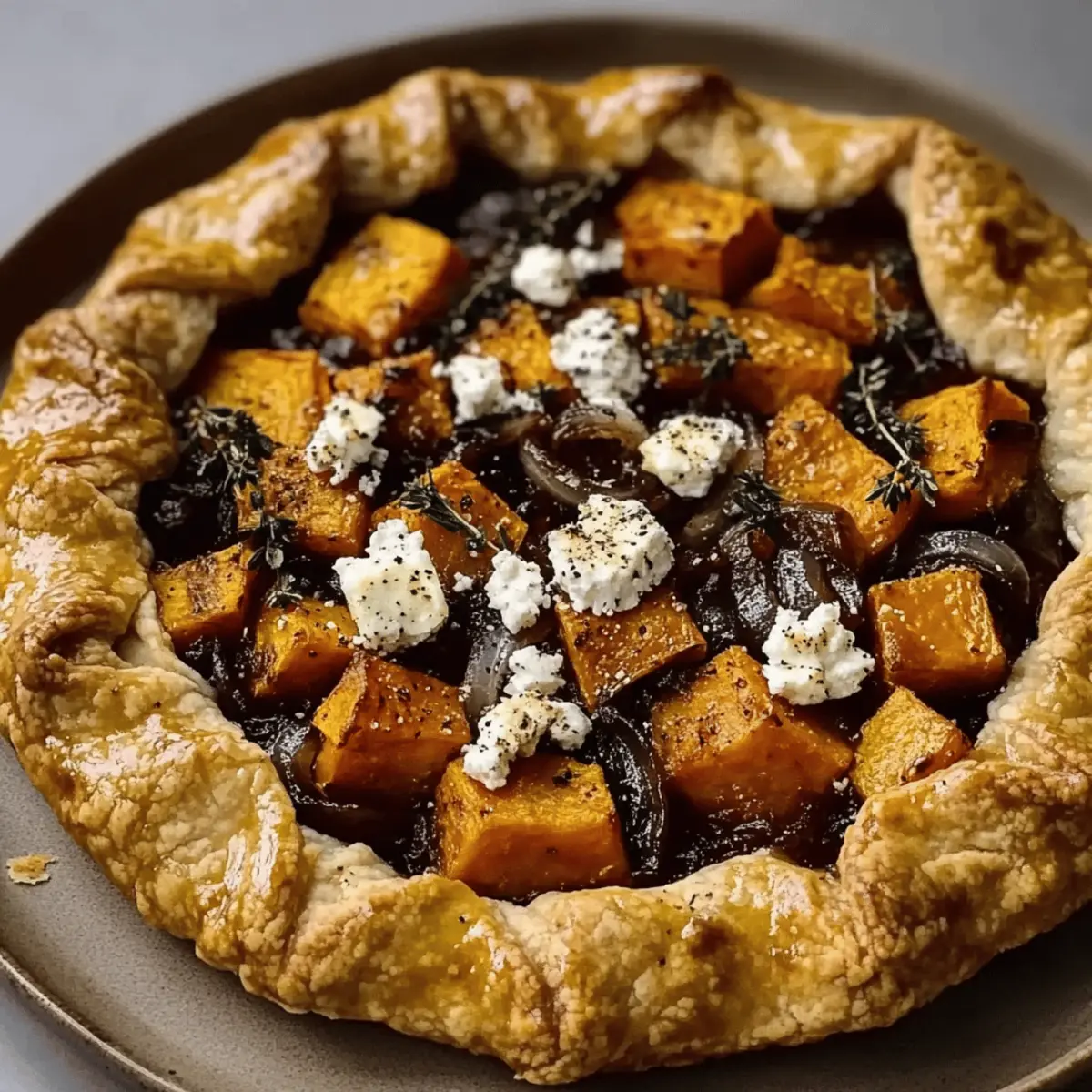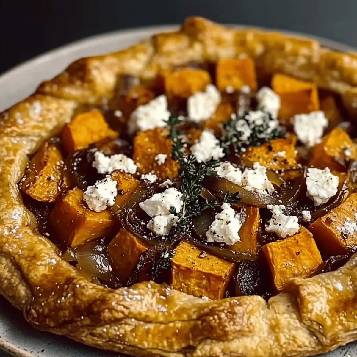 Once the sweet potatoes are done roasting, gather your chilled puff pastry. Roll it out on a sheet of parchment paper until it’s about 12 inches in diameter. Spread the caramelized onions in the center, leaving a 2-inch border. Layer the roasted sweet potatoes on top, crumble feta cheese over them, and finish with a sprinkle of fresh thyme for that aromatic touch.