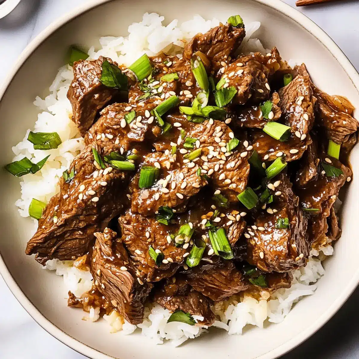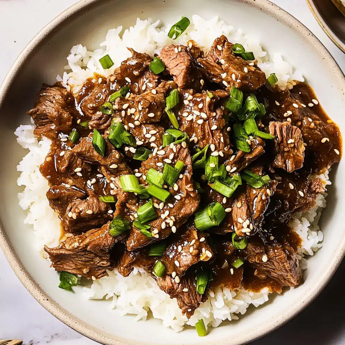 - Once the beef is cooked to perfection, scoop generous portions over cooked white rice and sprinkle with chopped scallions, cilantro, and toasted sesame seeds.