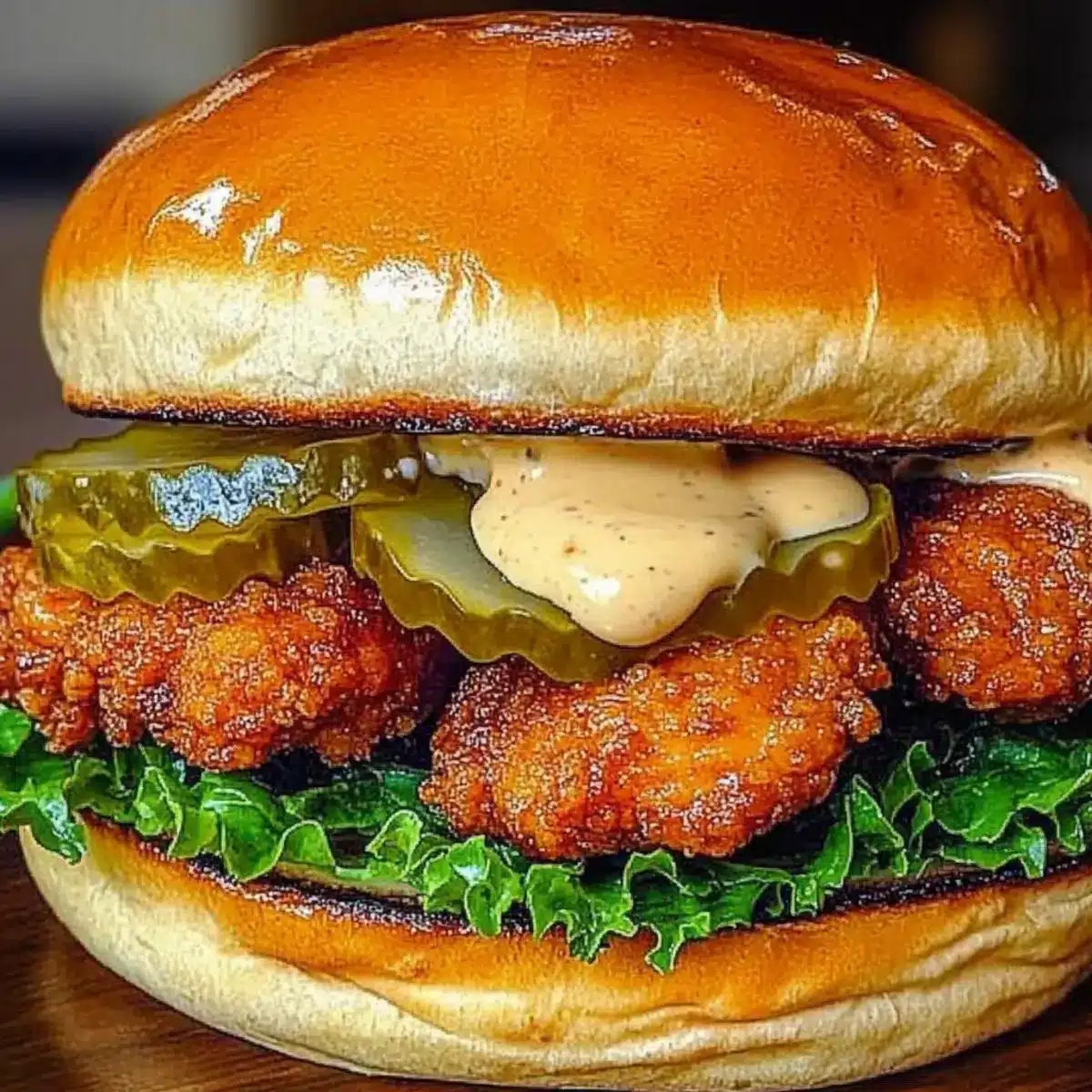 Lightly toast the brioche burger buns to enhance their texture. Spread a generous amount of your creamy sauce on the bottom half of each bun. Place a crispy chicken fillet on top, followed by dill pickle slices, fresh lettuce leaves, and sliced tomato to complete the assembly of your spicy chicken sandwich.