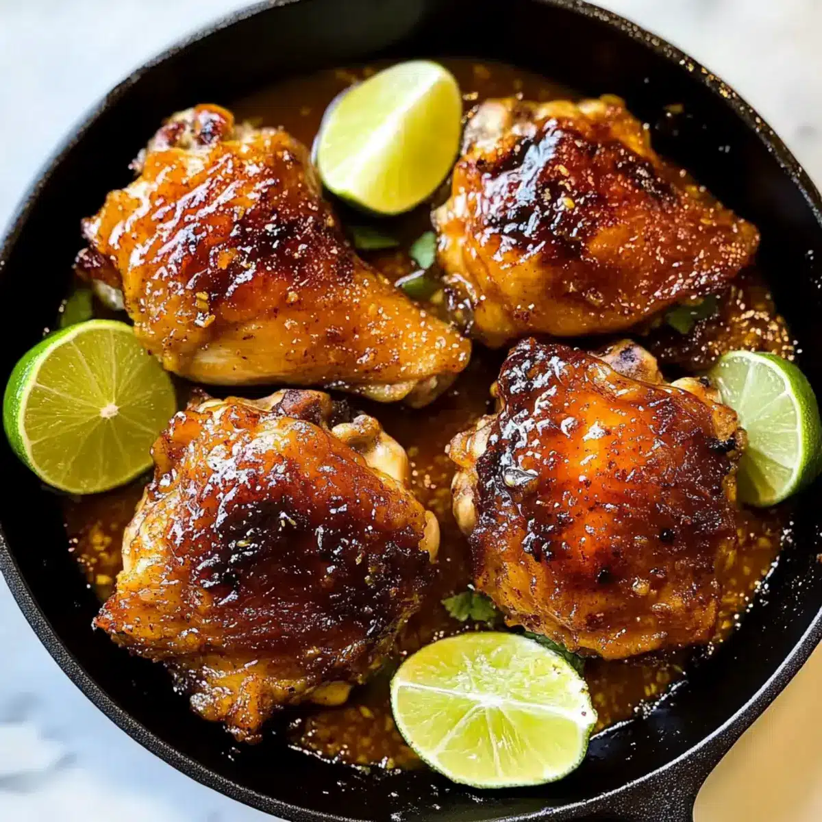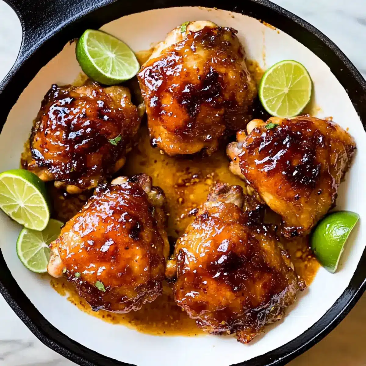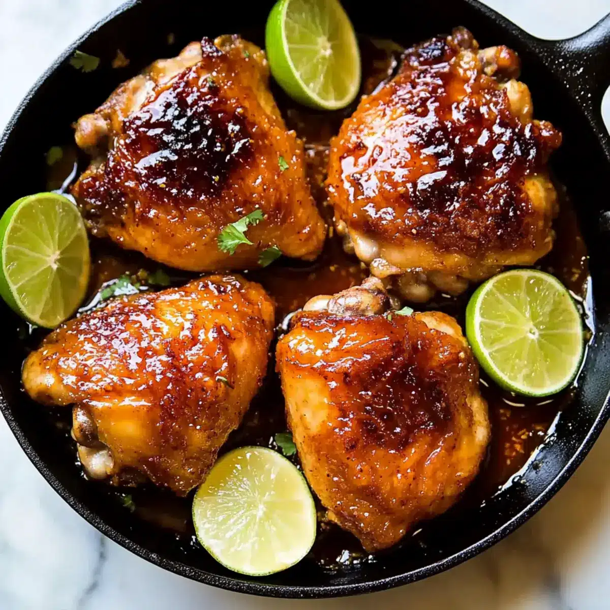 Once done, remove the skillet from the oven and let the chicken rest for a few minutes. Serve your delicious Sweet Chili-Glazed Chicken Thighs with lime wedges on the side, allowing everyone to add an extra zing of citrus if they wish. Pair them with fluffy jasmine rice or steamed veggies for a complete meal that everyone will love!