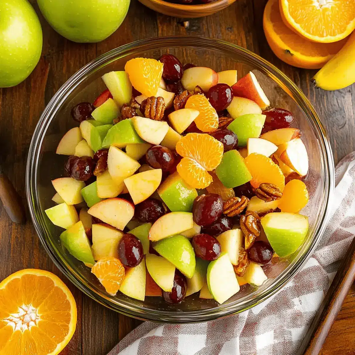 - In a mixing bowl, combine apple pieces, segmented oranges, grapes, cranberries, and cooled pecans. Gently fold until evenly mixed.