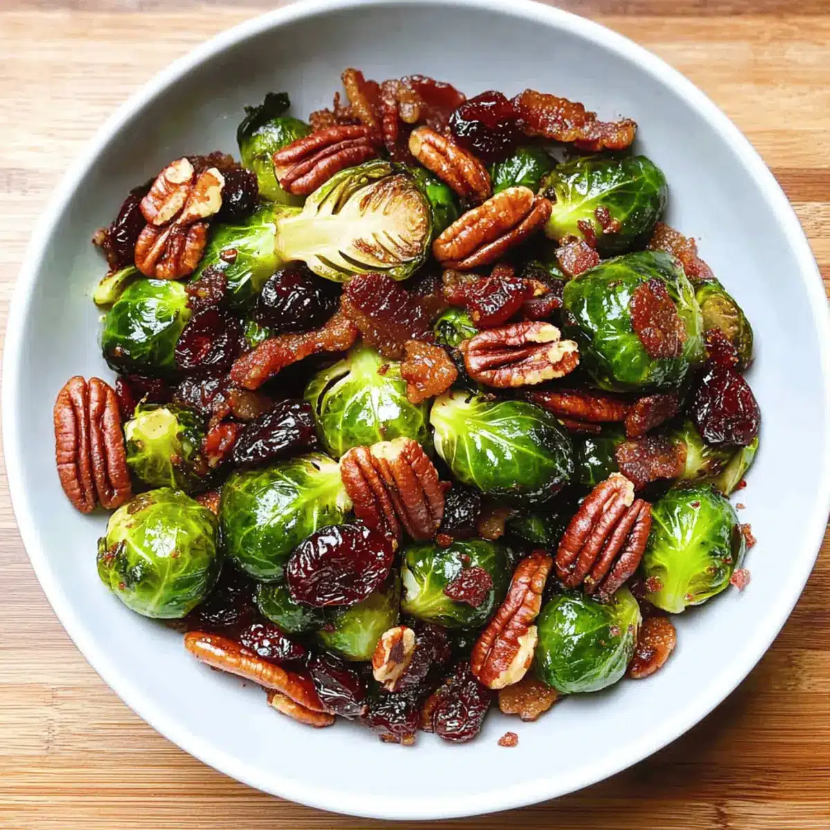 - In a large serving bowl, combine Brussels sprouts, bacon, pecans, and cranberries. Toss gently to mix.