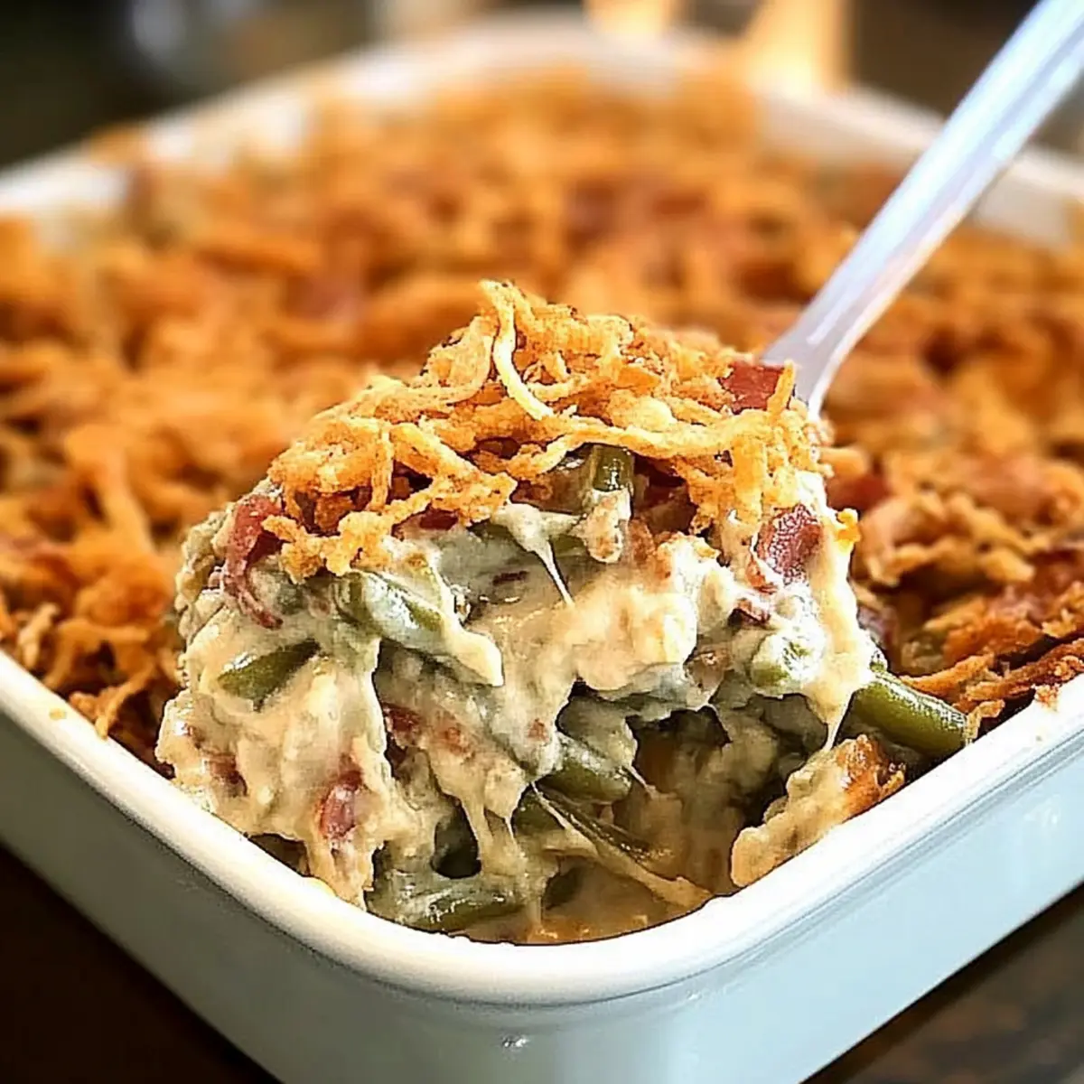 Irresistible Comfort: This Ultimate Green Bean Casserole combines silky, cheesy goodness with bits of crispy bacon to create a dish that’s both comforting and indulgent.